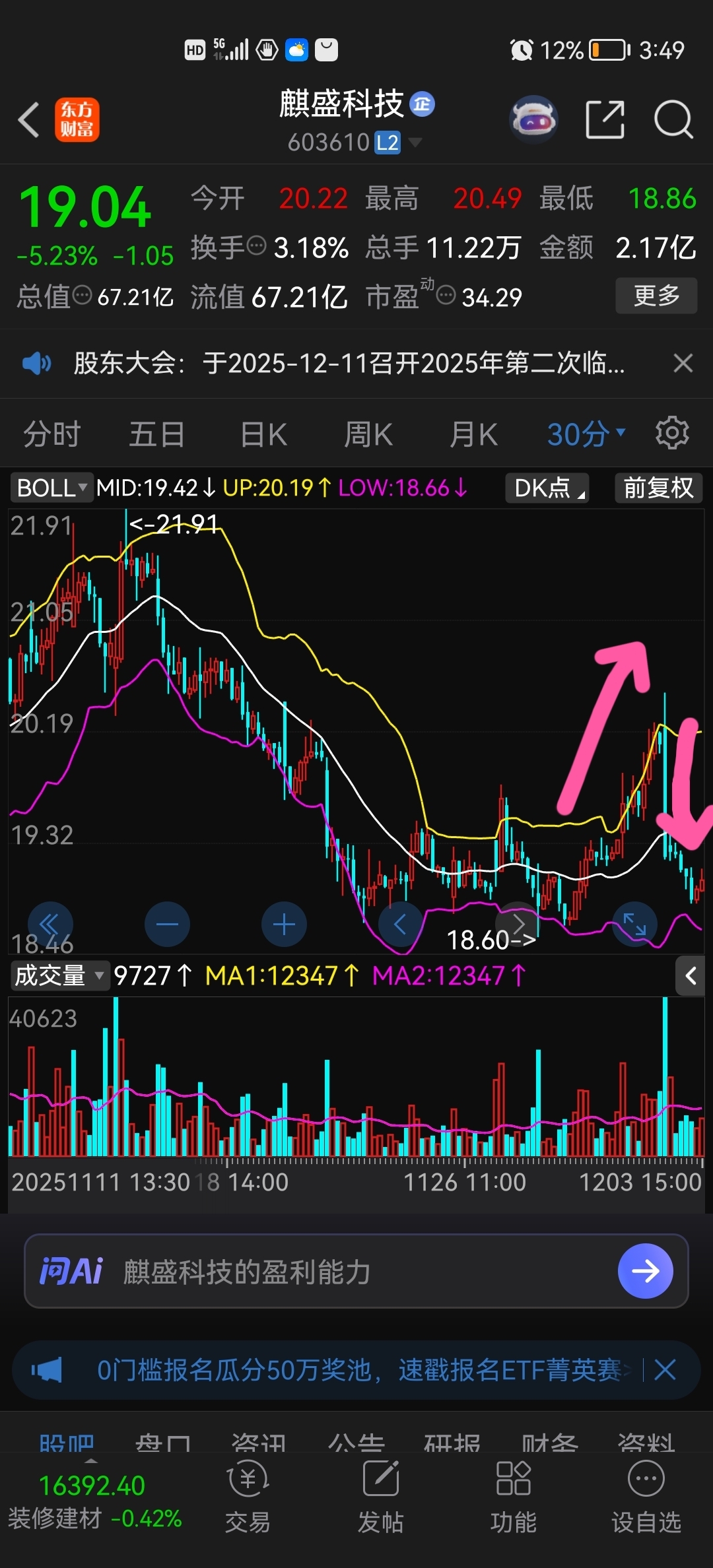 昨日30分钟堆量上推,布林线开口。今日30分钟极限下砸,此走法与布林线开口相背。