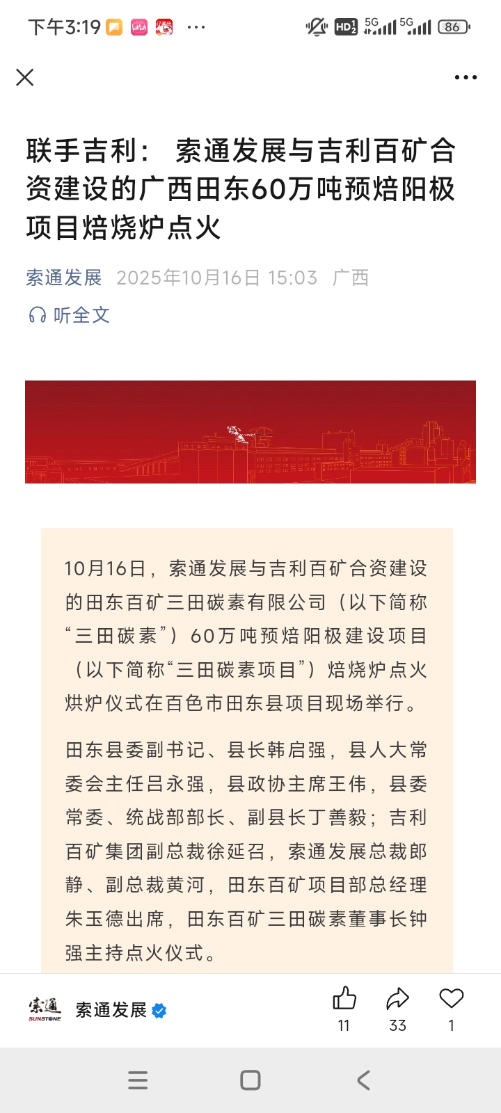 $索通发展(SH603612)$ 收盘就在公众号发新闻,下午拉升也是因为这个吧