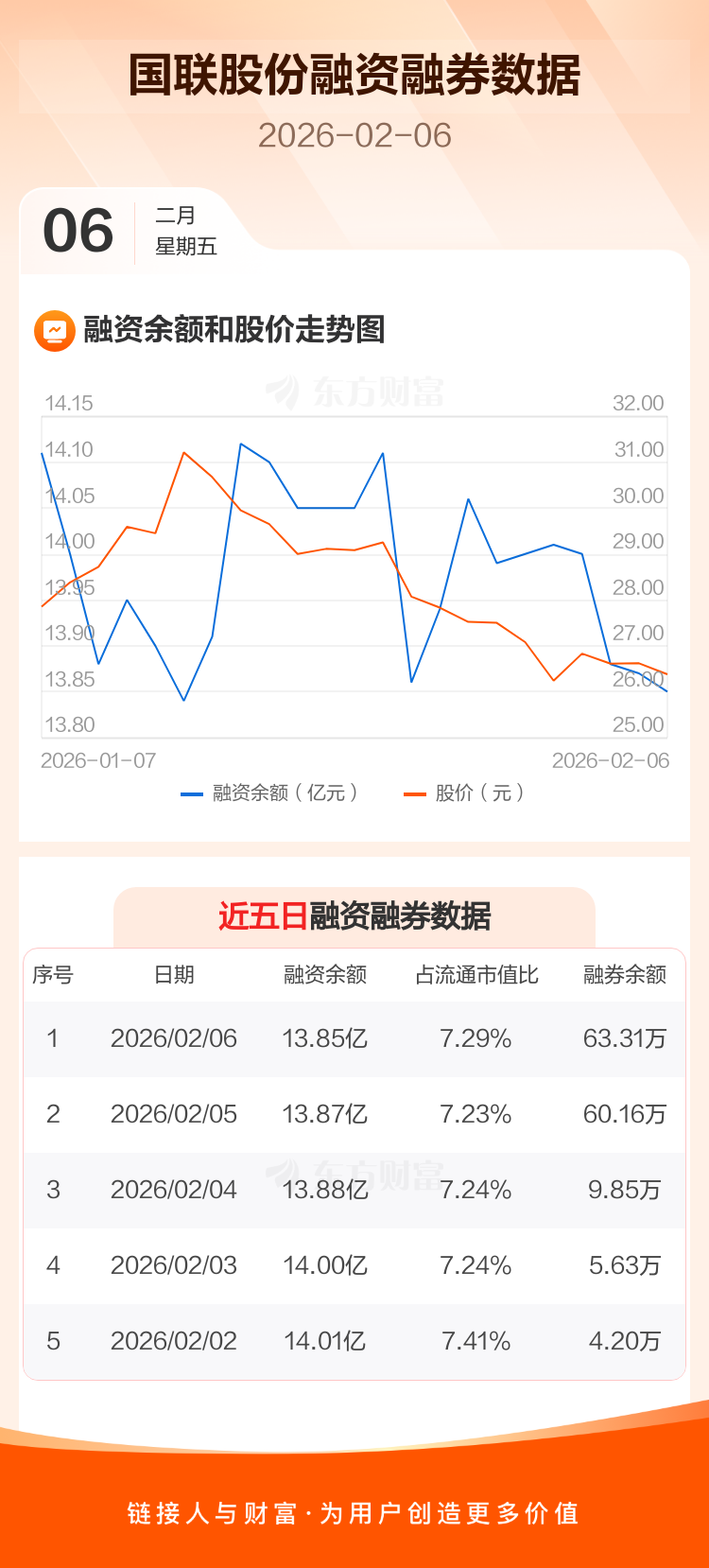 交易所最新数据显示,国联股份于2026年2月6日获融资买入1412.68万元,融资偿还1597.36万元,当日融资净偿还184.68万元。目前,该股融资余额13.85亿,占流通市值比例为7.29%。