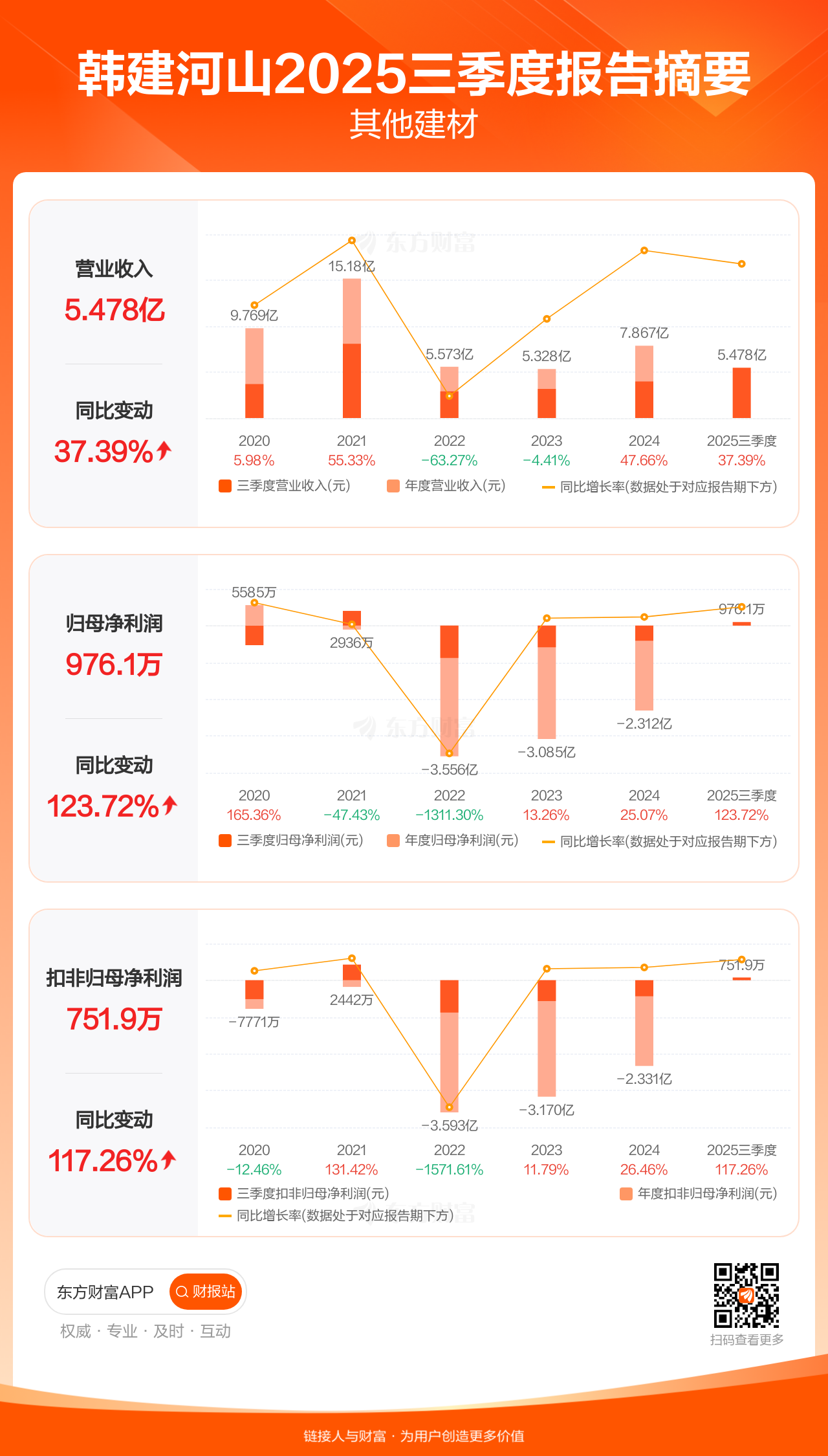 韩建河山10月31日发布2025年三季报显示,公司前三季实现营业收入5.48亿元,同比增长37.39%;归母净利润976.12万元,同比增长123.72%;扣非归母净利润751.94万元,同比增长117.26%。