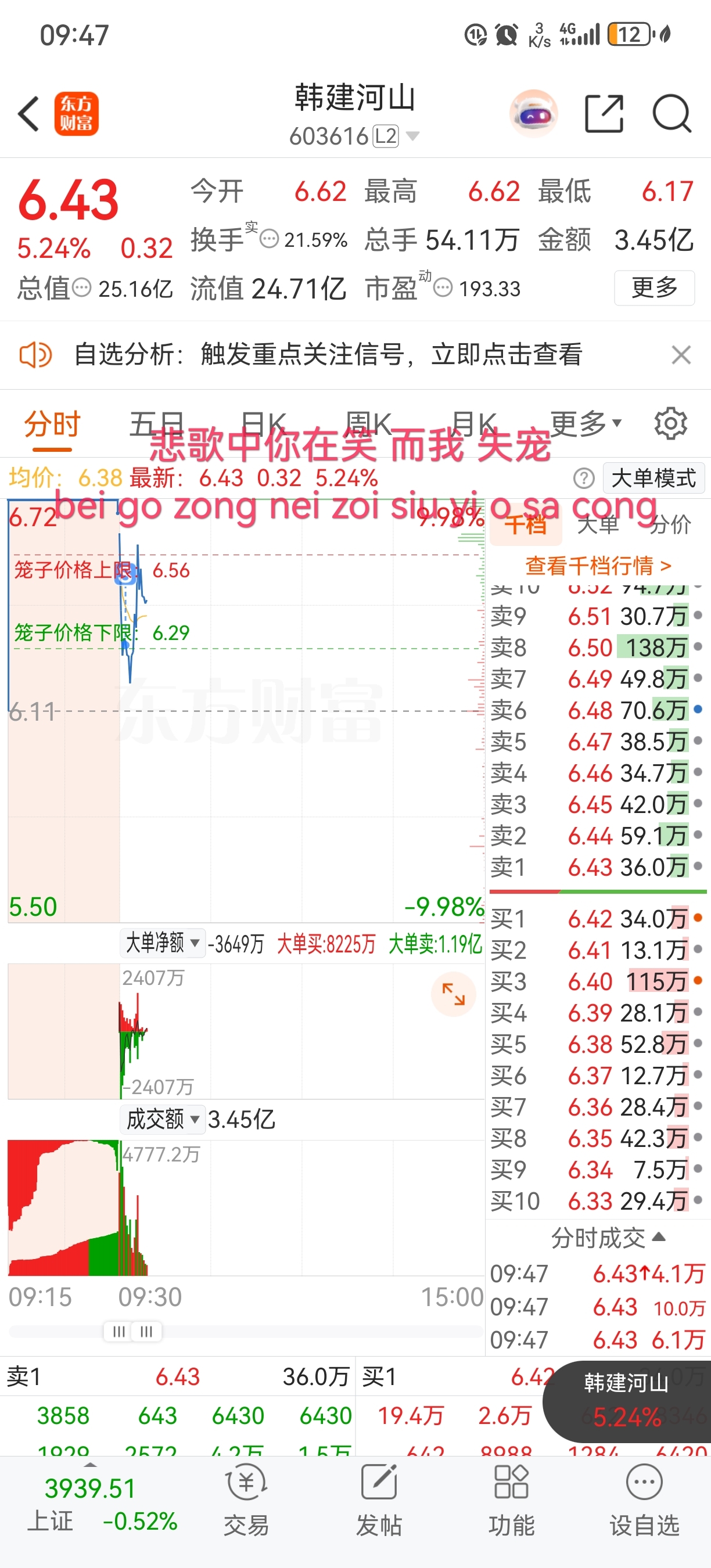 $韩建河山(SH603616)$ 为啥你们挂6.62都出去了 我没出去