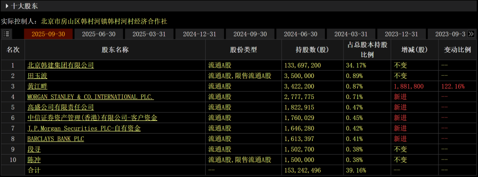 时代周报记者注意到,多家外资机构已提前“埋伏”,2025年第三季度,大摩、高盛、小摩、巴克莱、瑞银集团新进成为韩建河山前十大流通股东。