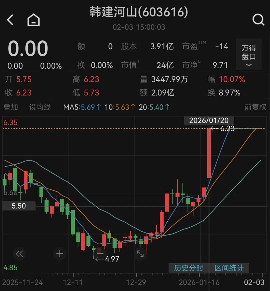 Wind数据显示,韩建河山停牌前一个交易日(1月20日),公司股价涨停,收报6.23元/股,最新市值为24亿元。