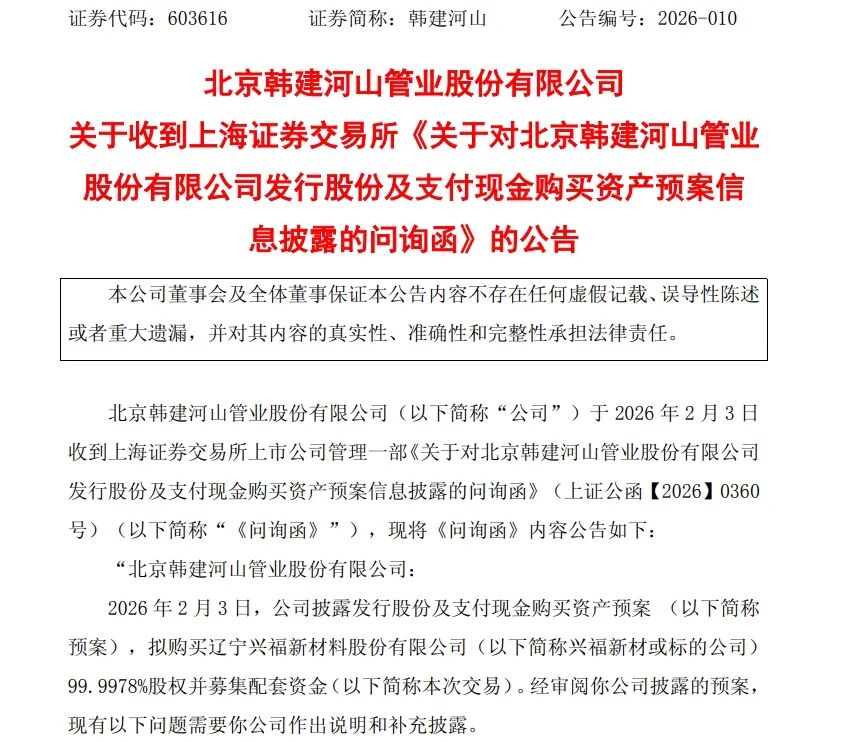 同日晚间,韩建河山公告称,2月3日,公司收到上海证券交易所公司管理一部下发的《关于对北京韩建河山管业股份有限公司发行股份及支付现金购买资产预案信息披露的问询函》。