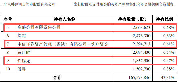 韩建河山部分前十大股东持股变动情况。图片来源:交易预案