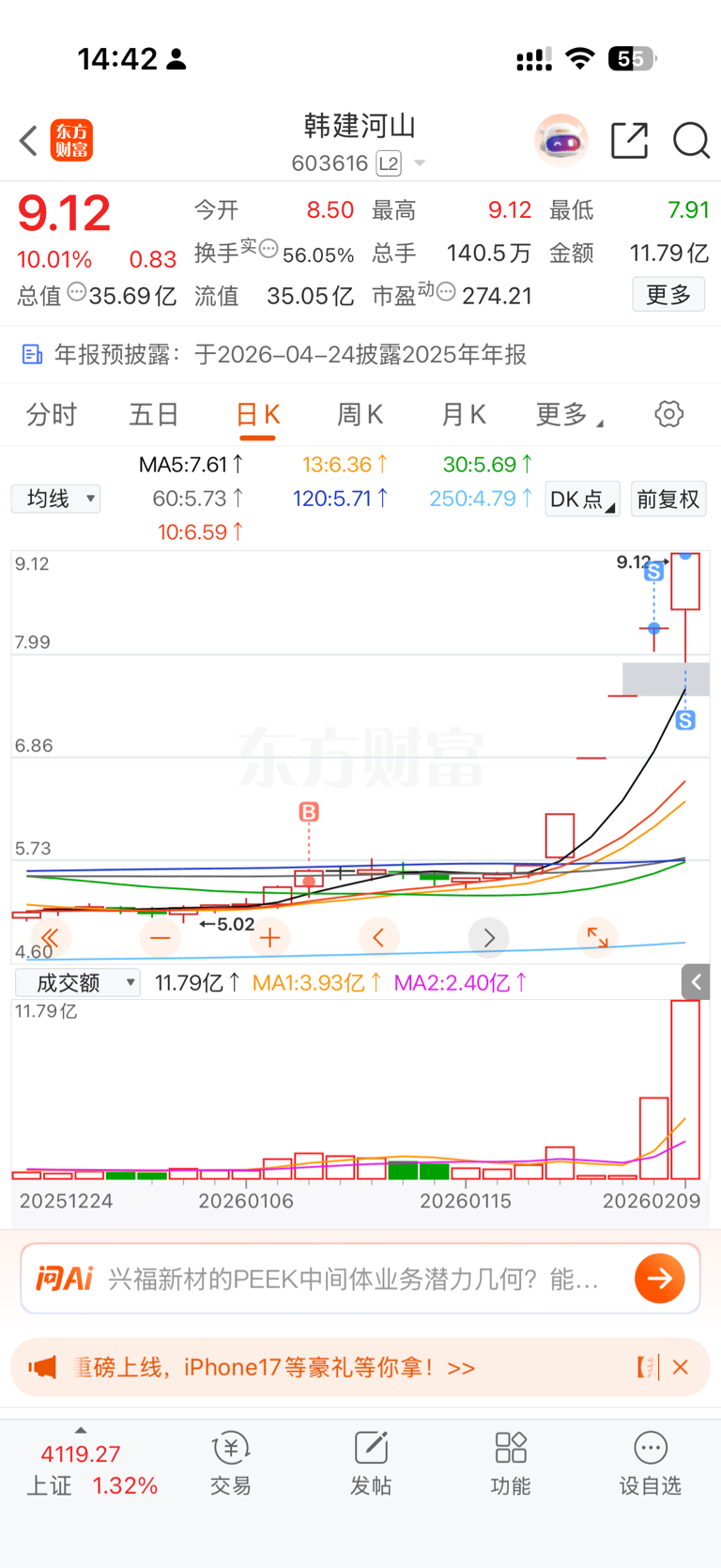 #炒股日记# 水利建设方面埋伏了两只票一只韩建一只青龙,韩建这次完全是靠运气,没想到会遇到收购这一回事,现在也是成市场短线最高标了,感谢市场,也希望在里面的朋友都上吃肉