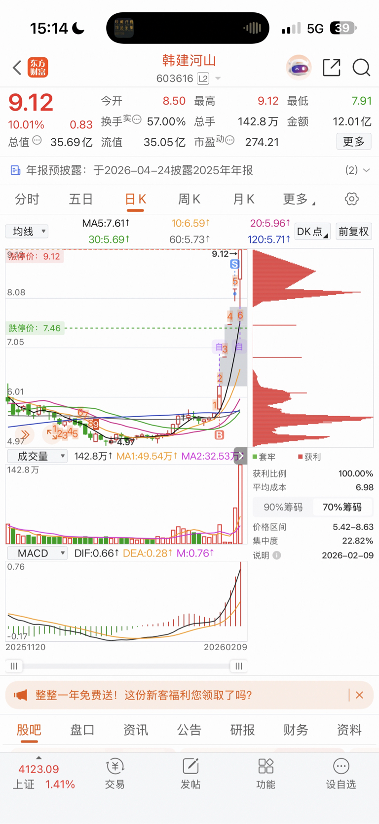 $韩建河山(SH603616)$ 本来今天要水下5%以上买的,结果拉起来了,我就不敢进了