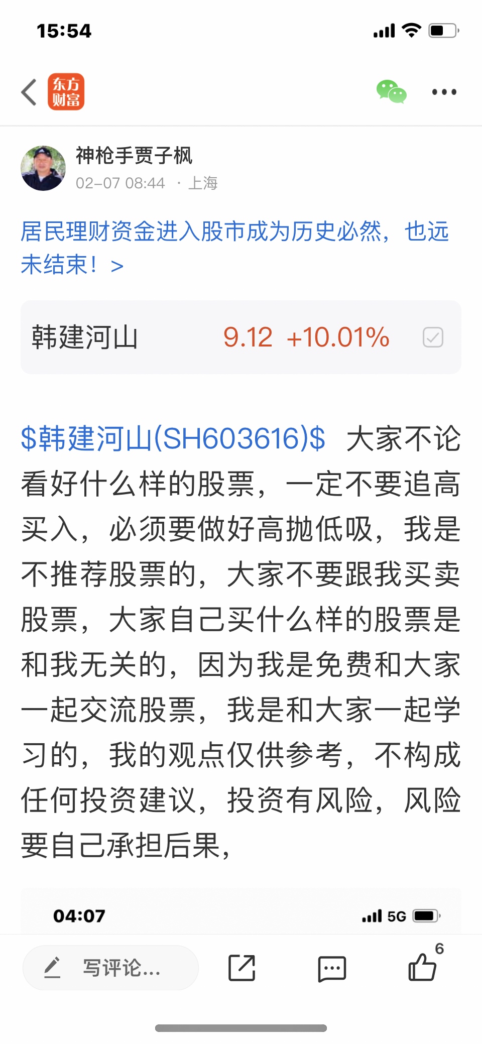 $韩建河山(SH603616)$ 大家不论看好什么样的股票,一定不要追高买入,必须要做好高抛低吸,我是不推荐股票的,大家不要跟我买卖股票,大家自己买什么样的股票是和我无关的,因为我是免费和大家一起交流股票,我是和大家一起学习的,我的观点仅供参考,投资有风险,风险要自己承担后果,
