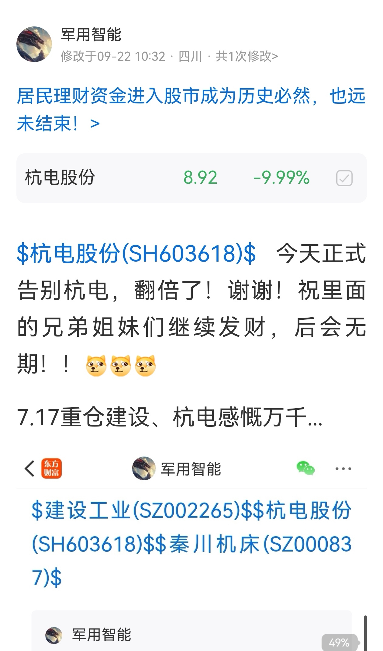 $杭电股份(SH603618)$ 6元多进,11.12涨停板走的,现在9元不到!本人不贪,只赚认知内的钱