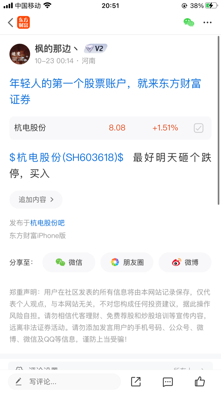 温馨提示: 1.根据《证券法》规定,禁止编造、传播虚假信息或者误导性信息,扰乱证券市场;2.用户在本社区发表的所有资料、言论等仅代表个人观点,与本网站立场无关,不对您构成任何投资建议。用户应基于自己的独立判断,自行决定证券投资并承担相应风险。《东方财富社区管理规定》