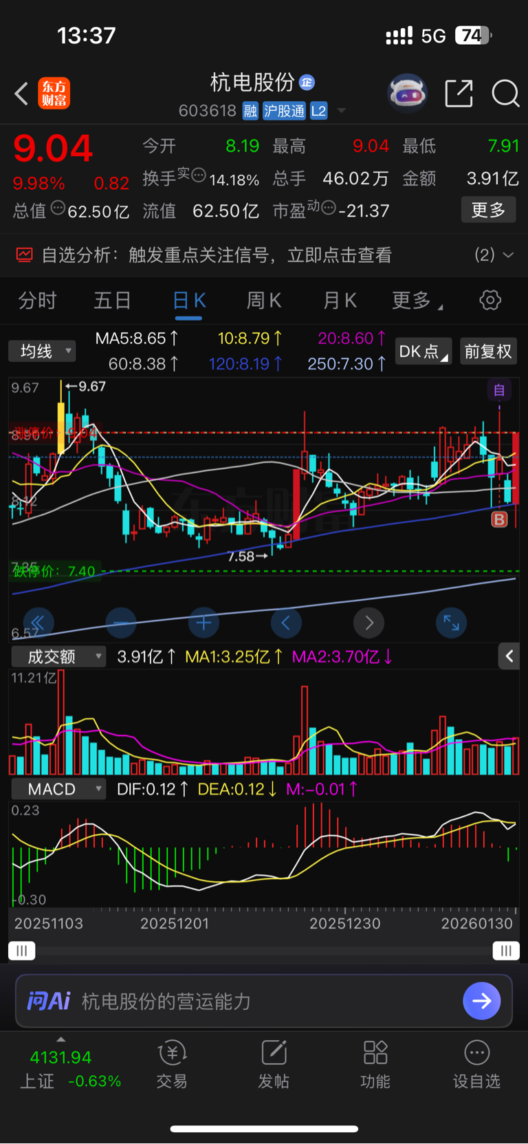 $杭电股份(SH603618)$ 今天8块以下想加仓的,可惜大盘太差,如果是正常行情我8块以下肯定会加的,一是摊平对半成本,因为我买进去到8块以下,几乎都要-10%了,我是10个点就补仓。二是也看好该股。可惜可惜