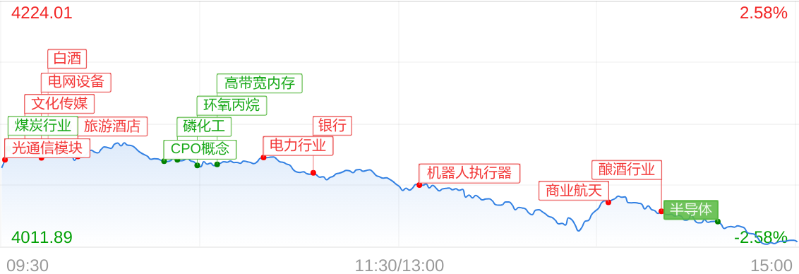 A股三大指数中深证成指领跌,截至收盘,上证指数下跌2.48%,深证成指下跌2.69%,创业板指下跌2.46%,北证50指数下跌2.03%。沪深两市成交额25847.65亿元,较上个交易日缩量2507.73亿。全市场771只个股上涨。板块题材上,特高压、智能电网、地热能板块涨幅居前,草甘膦、黄金概念、环氧丙烷板块跌幅居前。大盘表现