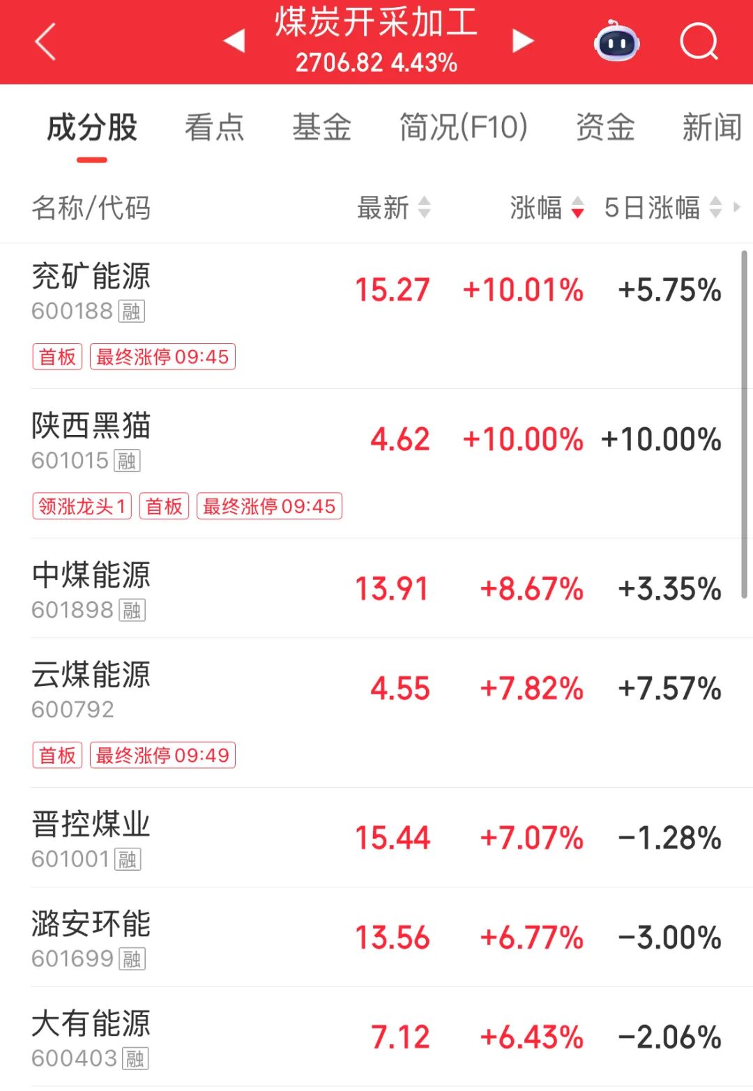 煤炭板块盘初拉升。兖矿能源、陕西黑猫涨停,云煤能源触及涨停,中煤能源、晋控煤业、潞安环能等多股跟涨。