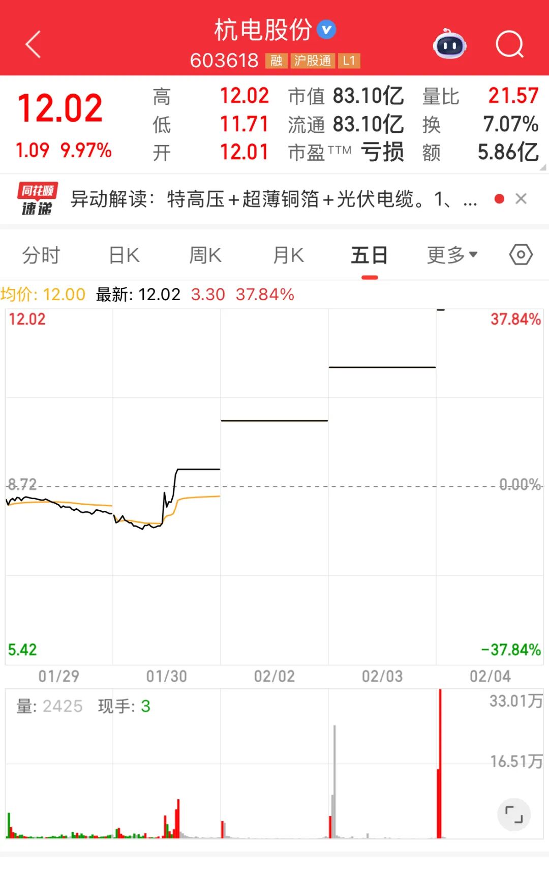 2月3日,杭电股份公告称,公司股票自2026年1月30日至2月3日连续3个交易日涨停,股价累计涨幅达32.97%,显著高于同行业水平。公司基本面未发生重大变化,市场情绪过热,存在非理性炒作风险。此外,公司最新滚动市盈率为负,绝对值高于同行业水平。此前公司预计2025年年度净利润为-3亿元。公司提醒投资者注意交易和业绩下降风险,理性决策。