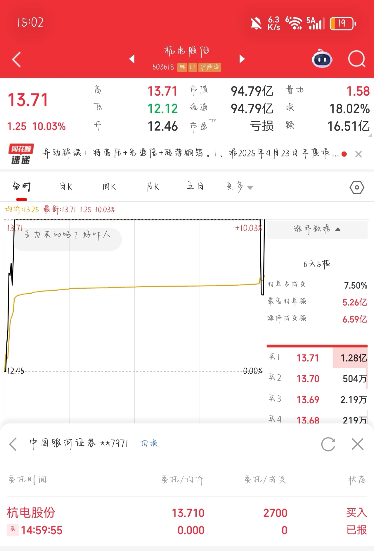 $杭电股份(SH603618)$ 为什么55s挂单没买进去,安箱操作?