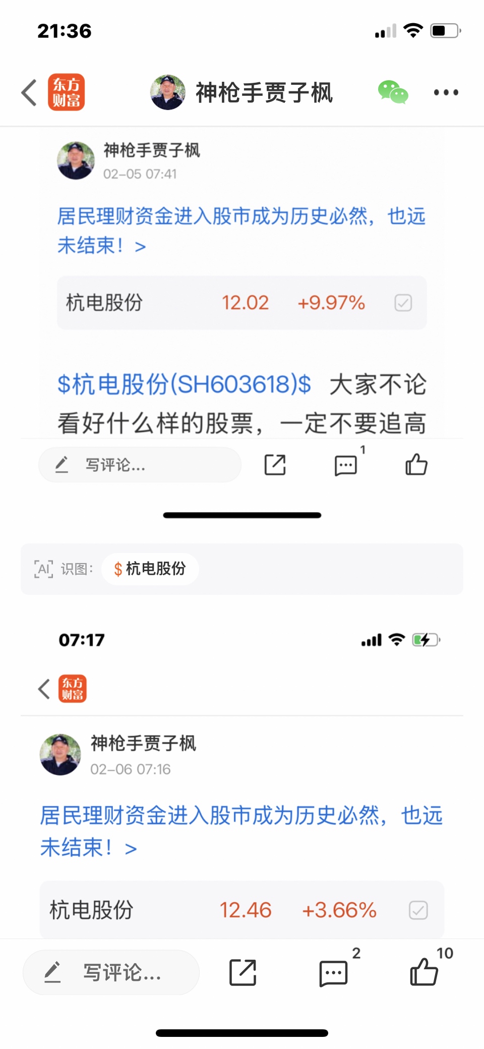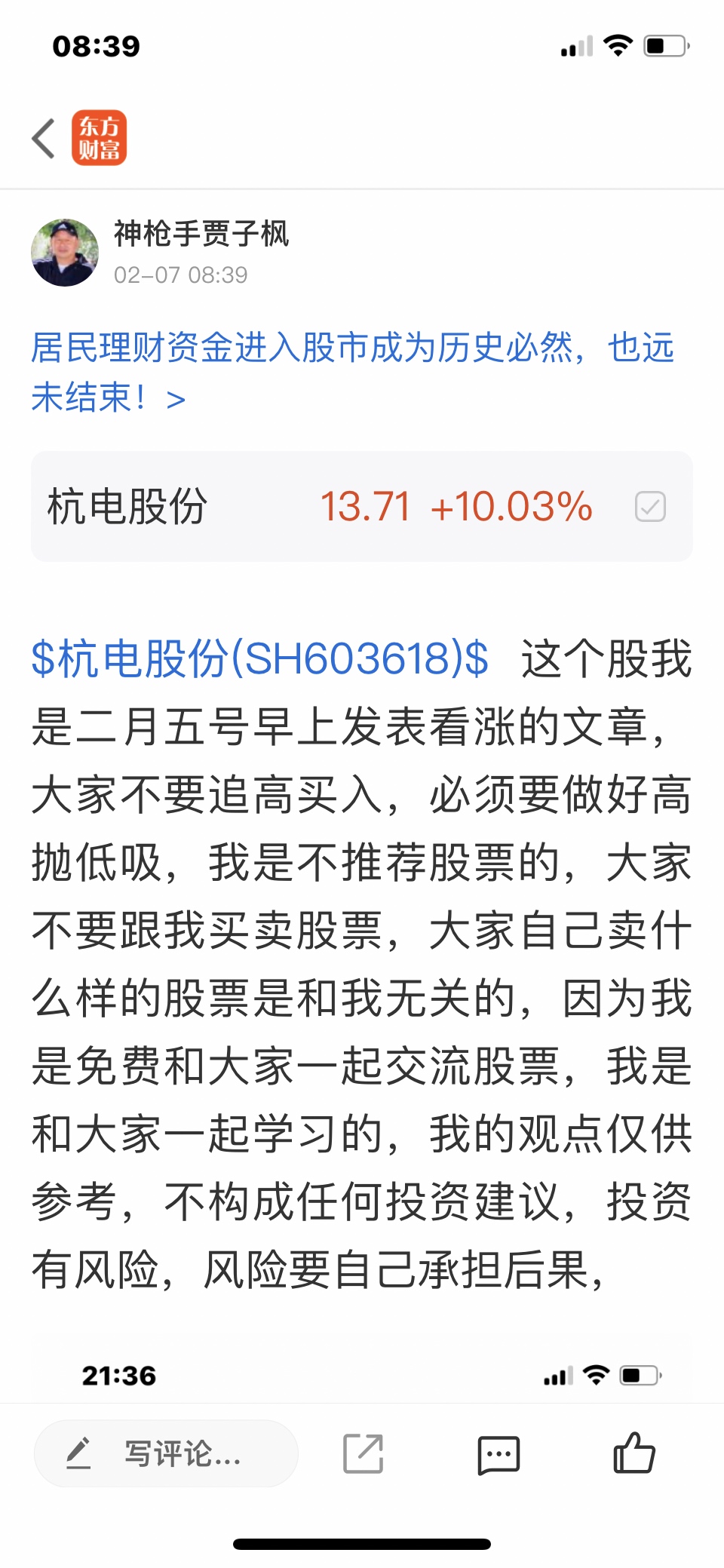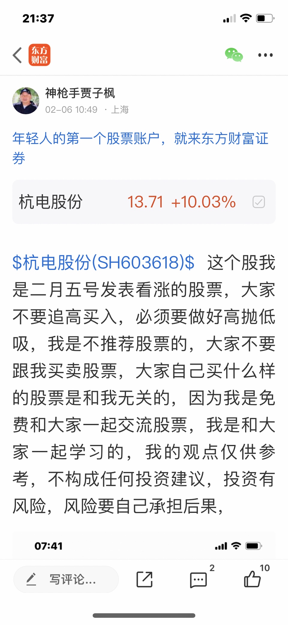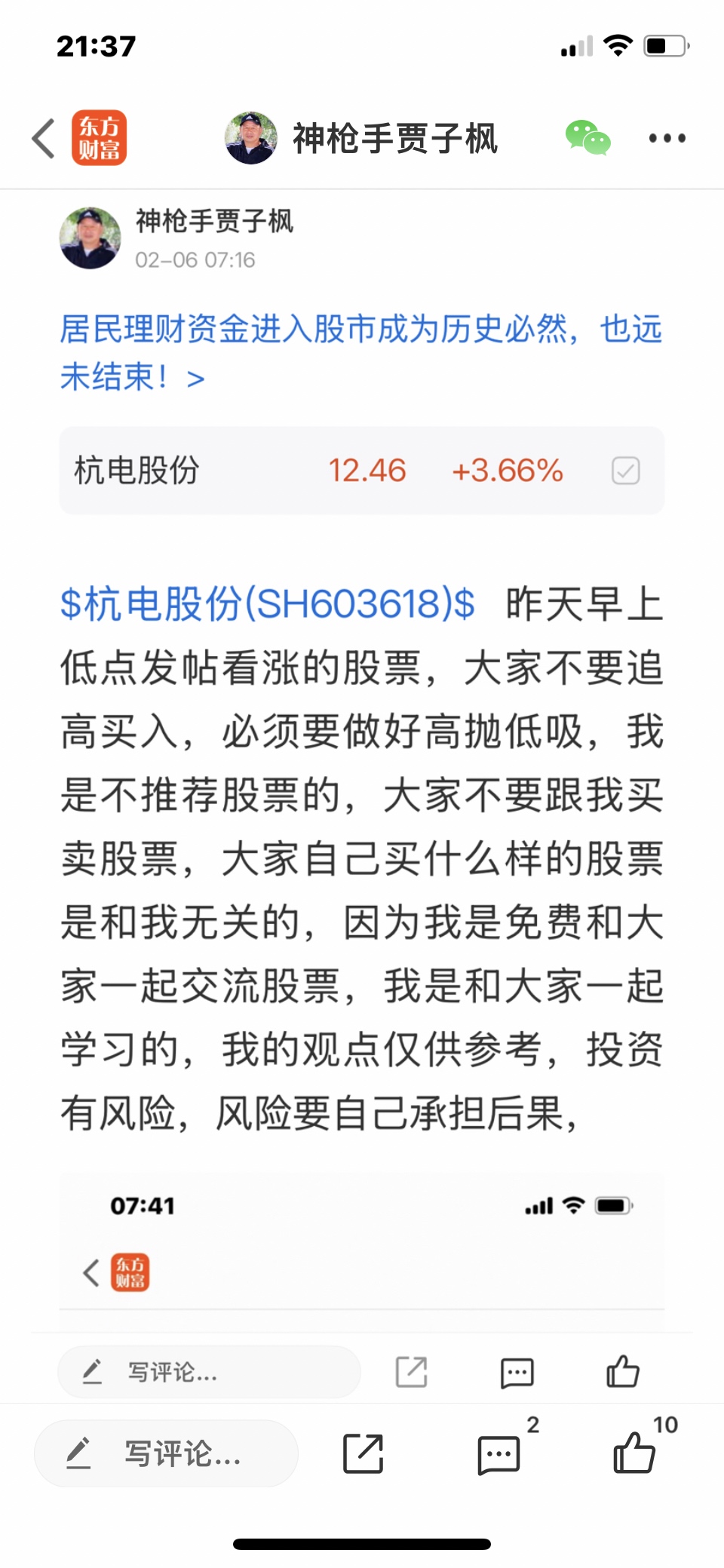 $杭电股份(SH603618)$ 这个股我是二月五号早上发表文章看涨的股票,我是不推荐股票的,大家不要跟我买卖股票,大家自己买什么样的股票是和我无关的,因为我是免费和大家一起交流股票,我是和大家一起学习的,我的观点仅供参考,不构成任何投资建议,投资有风险,风险要自己承担后果,
