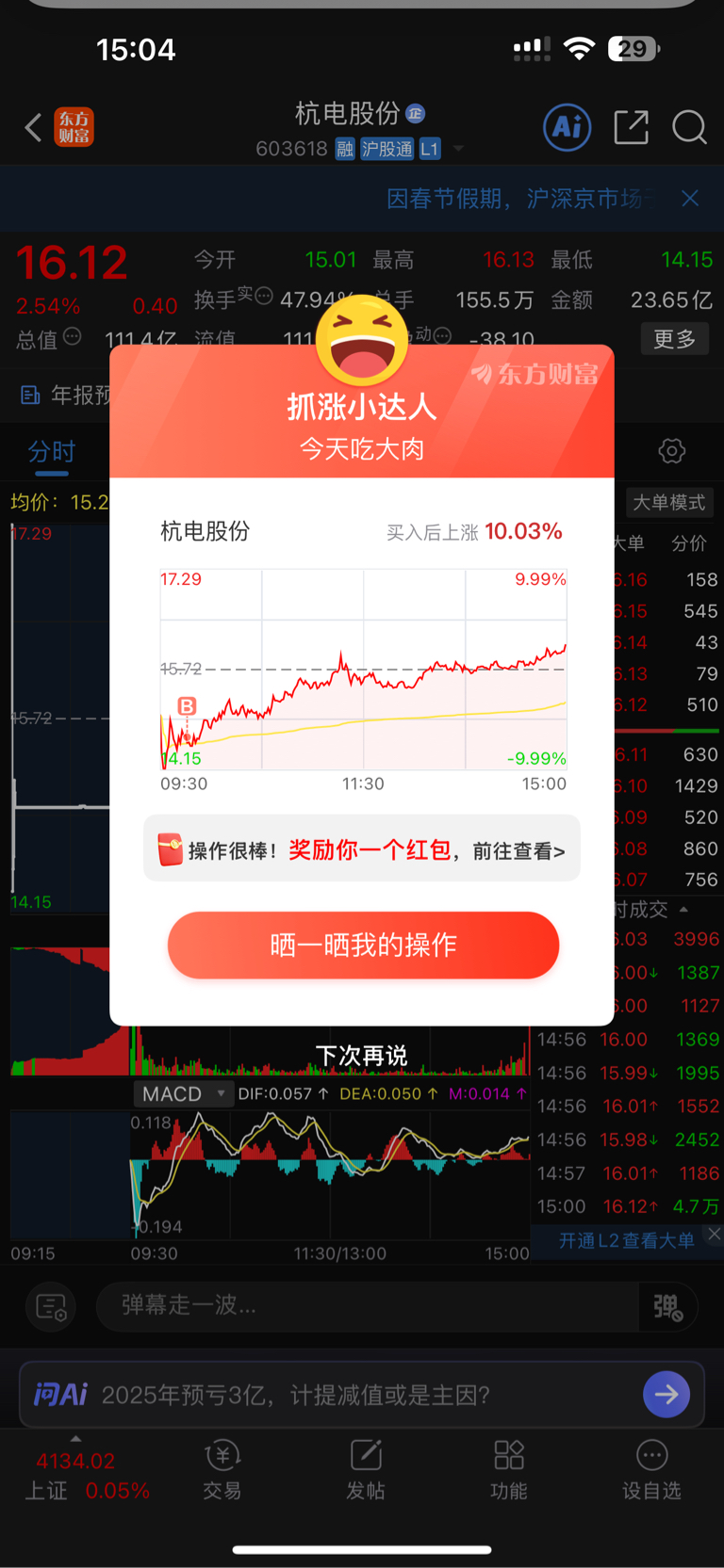 $杭电股份(SH603618)$ 水下买的 明天能活着出来吗