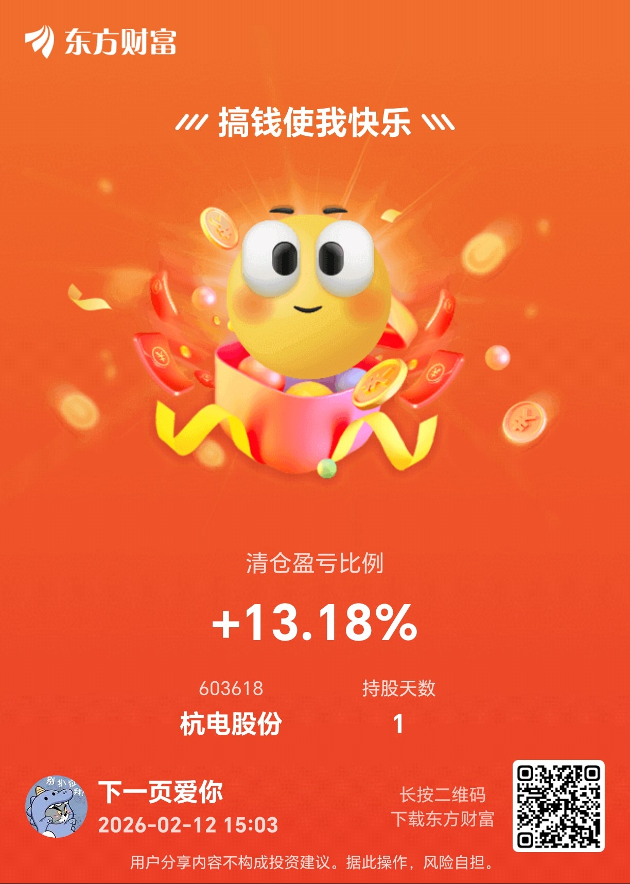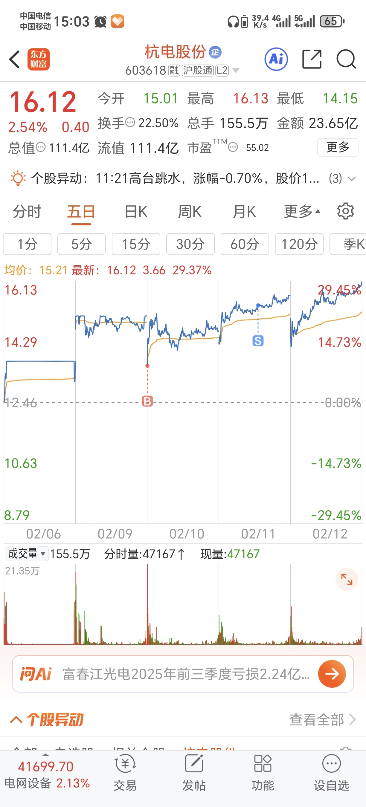 $杭电股份(SH603618)$ 真的很漂亮,这个走势,星期二那天我地板买了,星期三出了,今天想买的时候没钱,太可惜,又是十几个点的利润,一股差不多挣2块钱,尾盘竞价又抢了0.11毛,太牛掰了,这几天买这个票的人都挣到钱了,这才是为我们散户考虑的,他现在一直在破新高,破新高