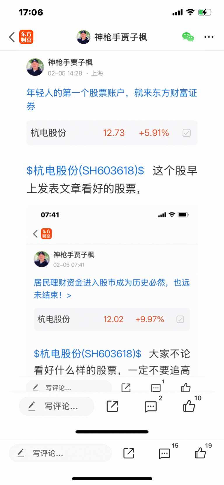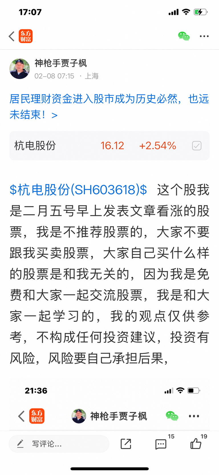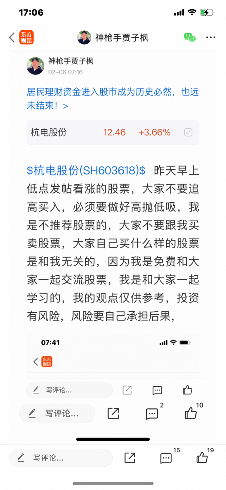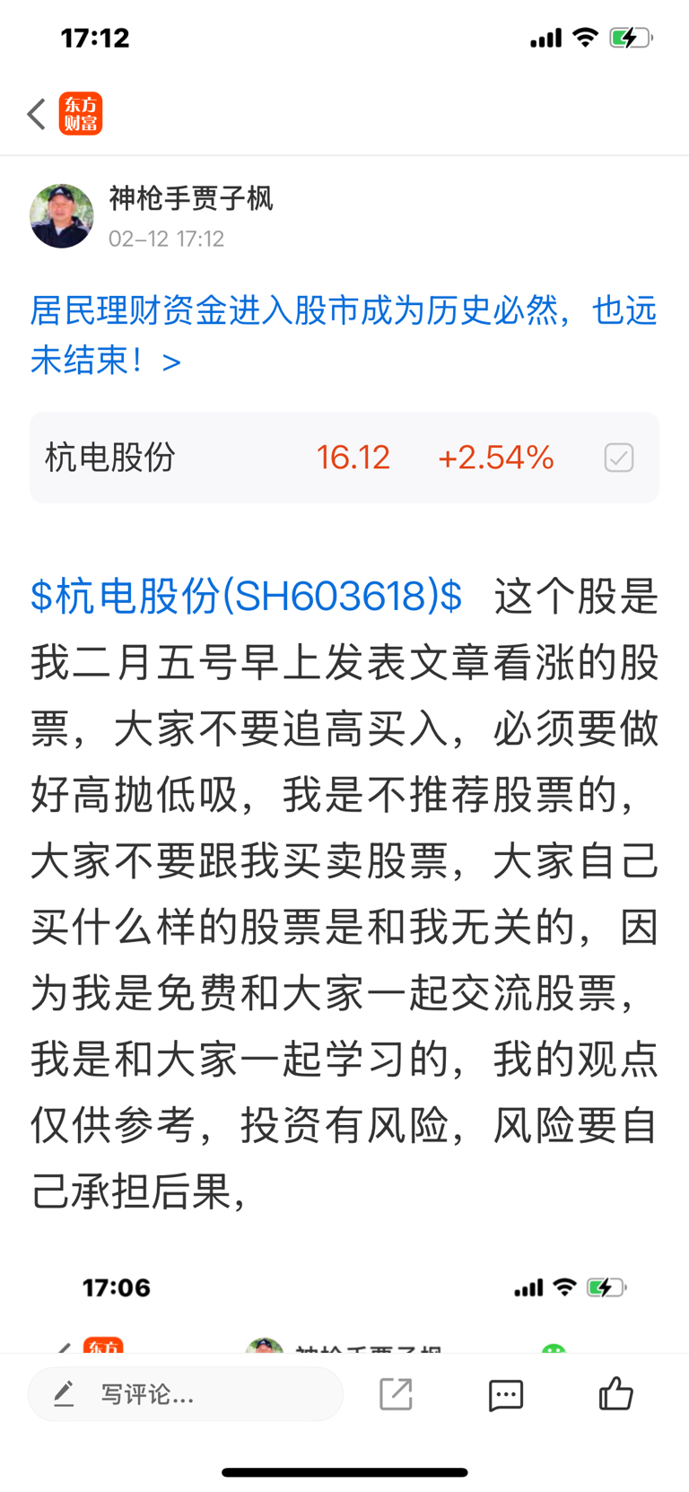 $杭电股份(SH603618)$ 这个股是我二月五号发表文章看涨的股票,大家不要追高买入,必须要做好高抛低吸,我是不推荐股票的,大家不要跟我买卖股票,大家自己买什么样的股票是和我无关的,因为我是免费和大家一起交流股票,我是和大家一起学习的,我的观点仅供参考,投资有风险,风险要自己承担后果,