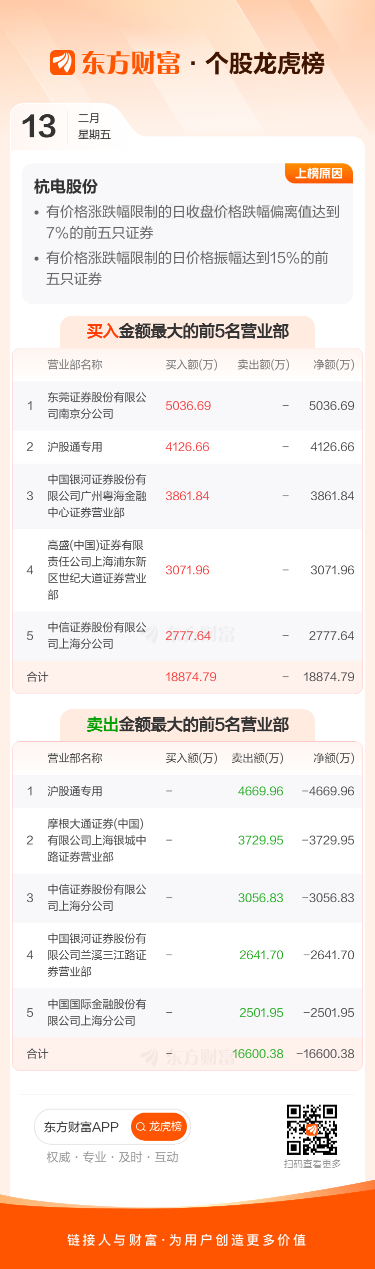 交易所2026年2月13日公布的交易公开信息显示,杭电股份因成为有价格涨跌幅限制的日收盘价格跌幅偏离值达到7%的前五只证券、有价格涨跌幅限制的日价格振幅达到15%的前五只证券上榜。杭电股份当日收报14.51元,涨跌幅-9.99%,偏离值-8.73%,换手率17.11%,成交额17.75亿。