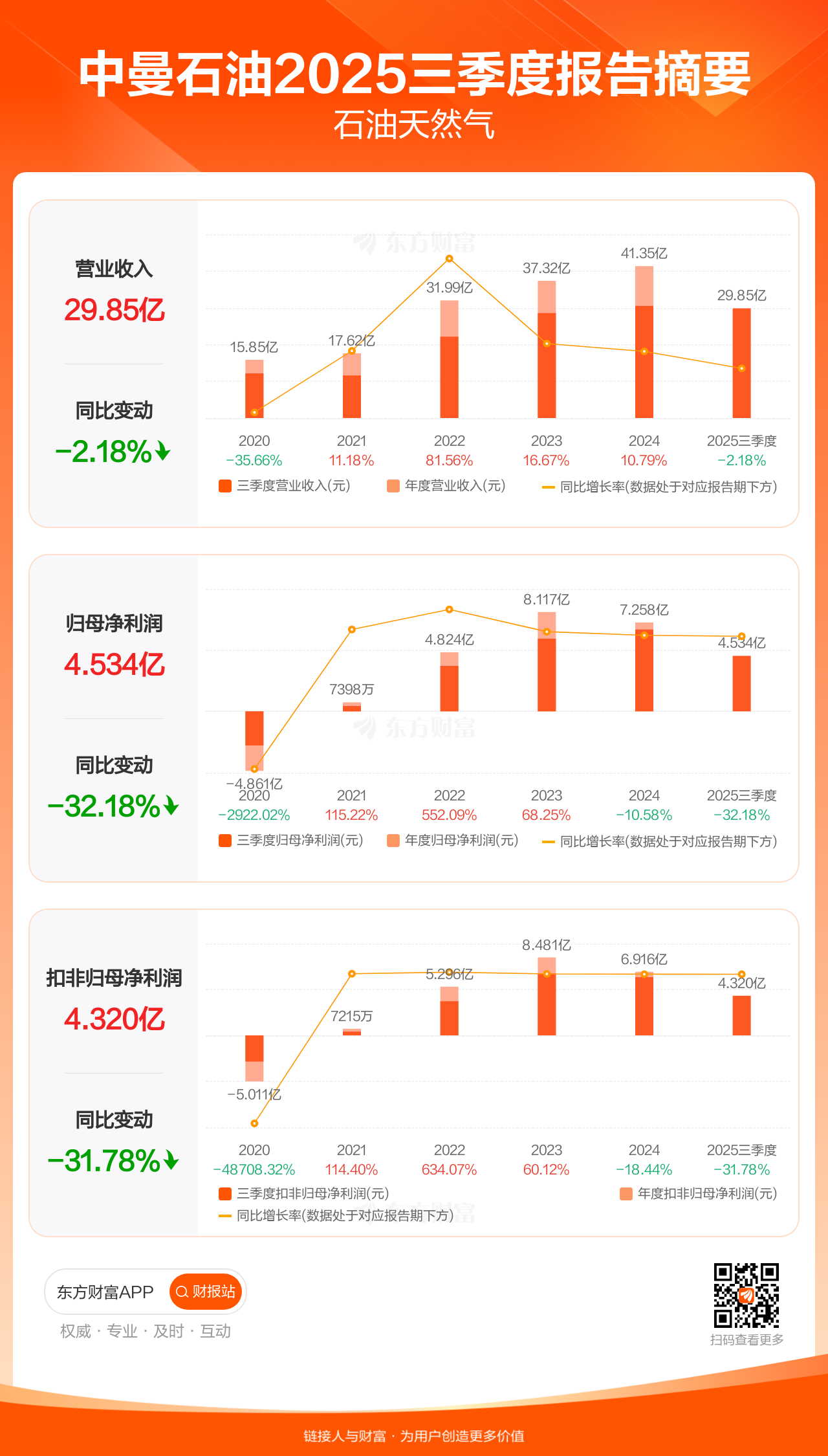 中曼石油10月31日发布2025年三季报显示,公司前三季实现营业收入29.85亿元,同比下滑2.18%;归母净利润4.53亿元,同比下滑32.18%;扣非归母净利润4.32亿元,同比下滑31.78%。