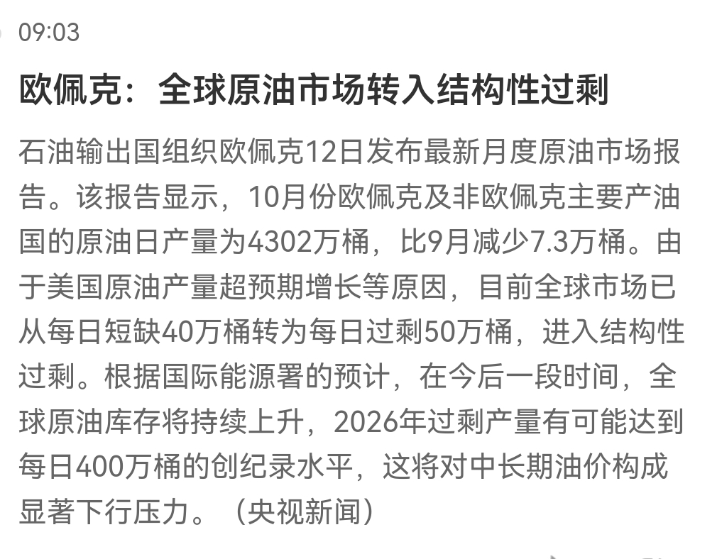 $中曼石油(SH603619)$ 2026年每日过剩400万桶