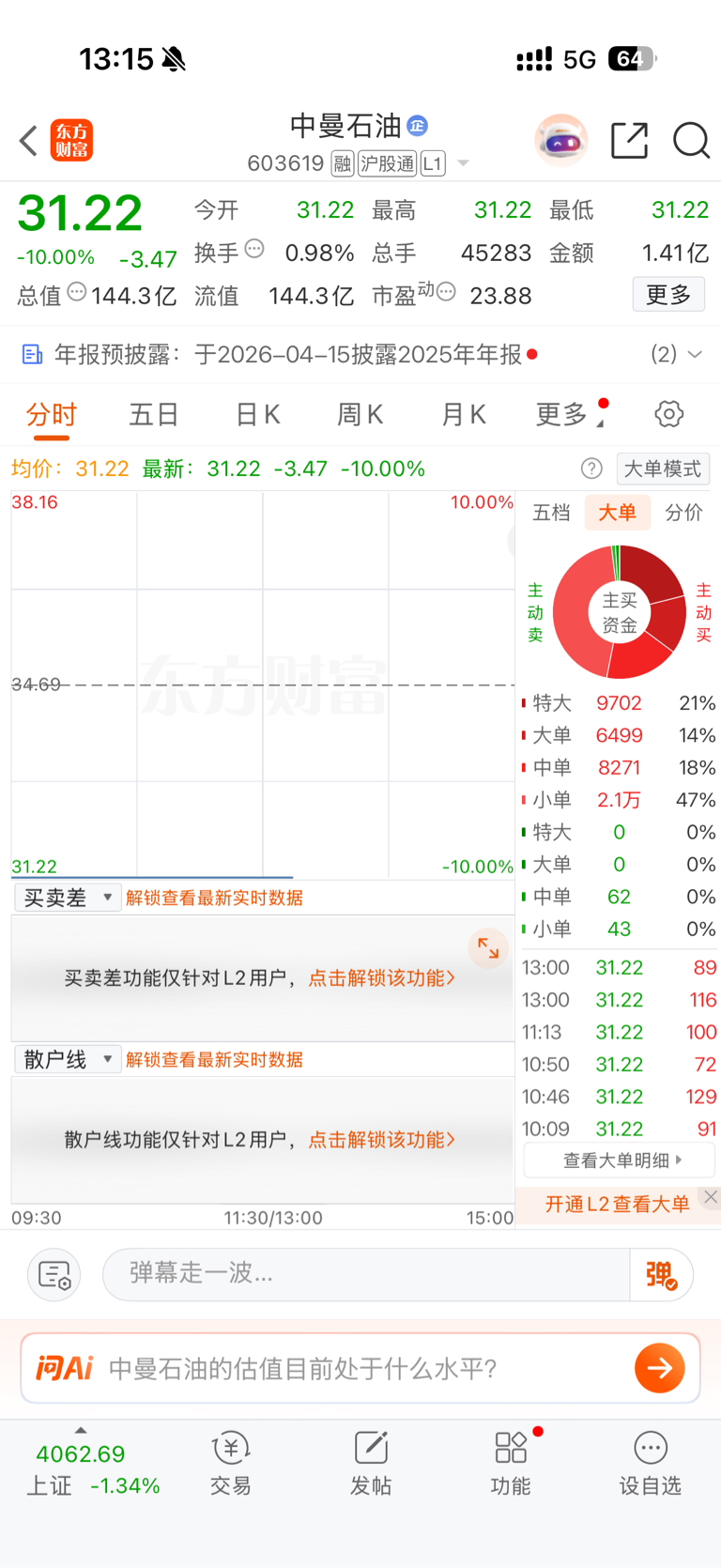 $中曼石油(SH603619)$ 全是大单买入,小单卖,搞不懂在怕什么
