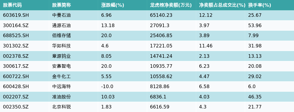 南财智讯3月4日电,盘后数据显示,因当日异动登上龙虎榜的个股中,龙虎榜中资金净流出最多的前三位分别是中曼石油(603619.SH)、通源石油(300164.SZ)与佰维存储(688525.SH)。其中排名第一的中曼石油被净卖出6.51亿元,占总成交金额的12.12%。中曼石油收盘上涨6.96%,换手率为25.67%。净卖出额前10个股详情见下图: