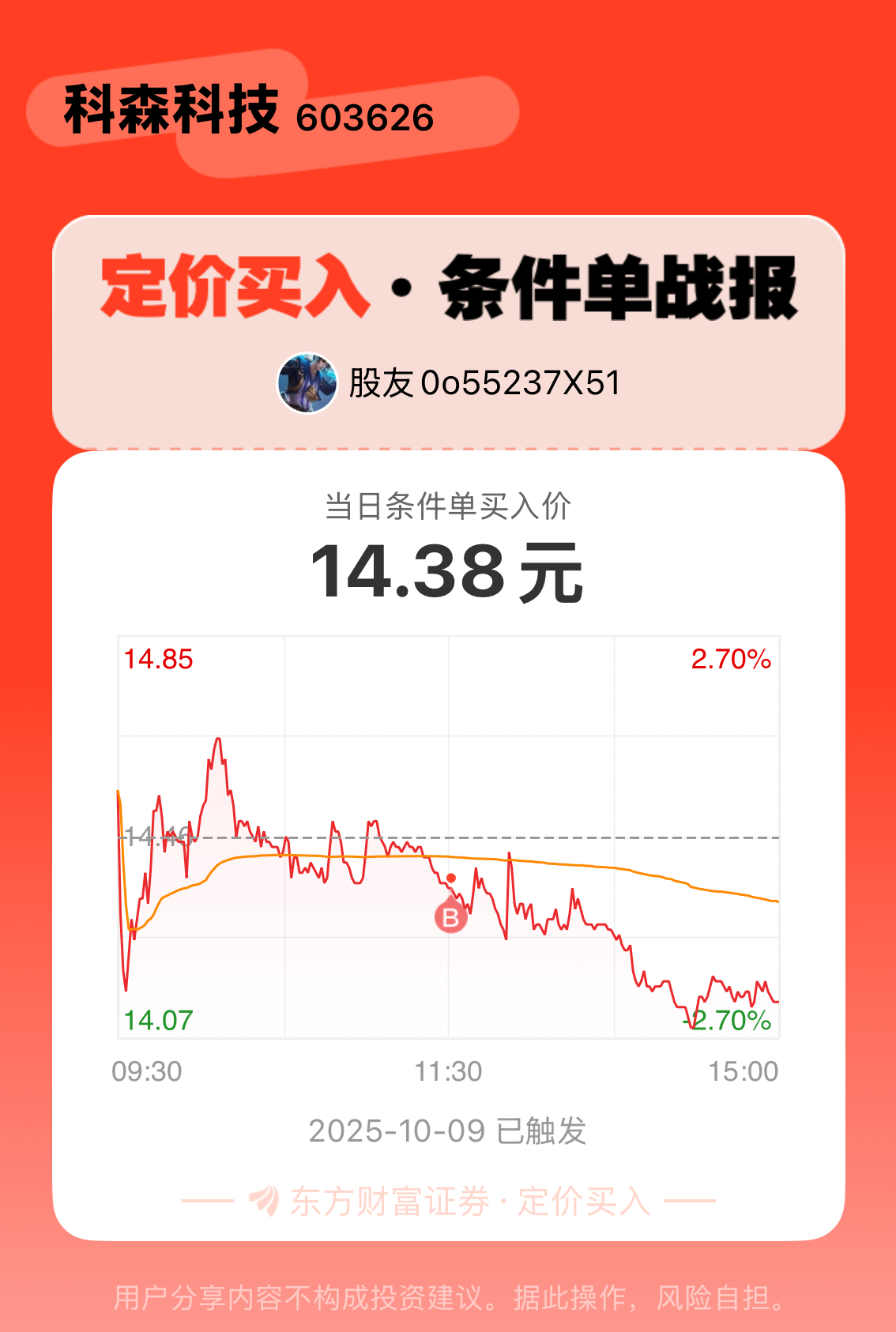 #条件单交流# #定价买入晒单# 我方派出一个定价买入条件单,立时就征服了$科森科技(SH603626)$
