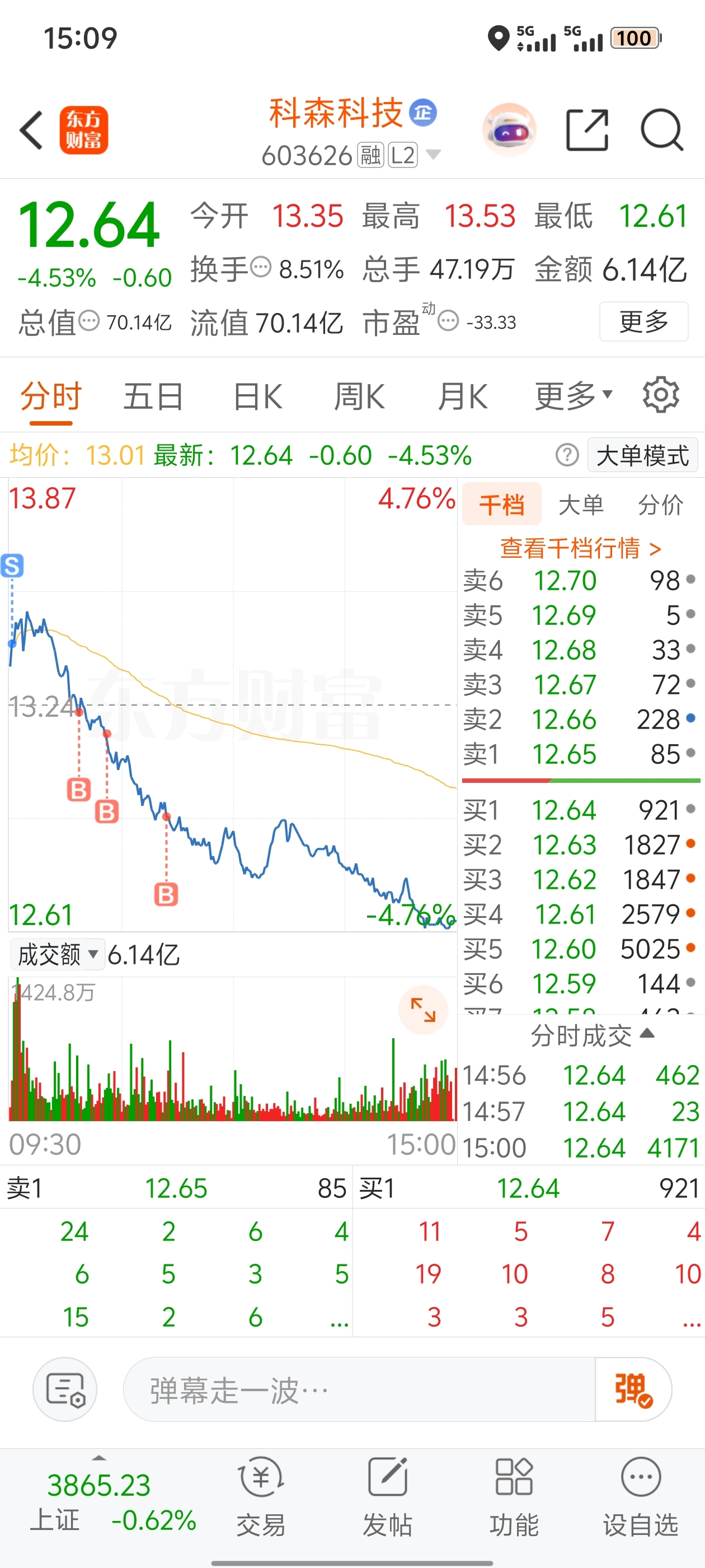 $科森科技(SH603626)$ 本来早盘13.41全卖了,忍不住又进来,结果吃大面,