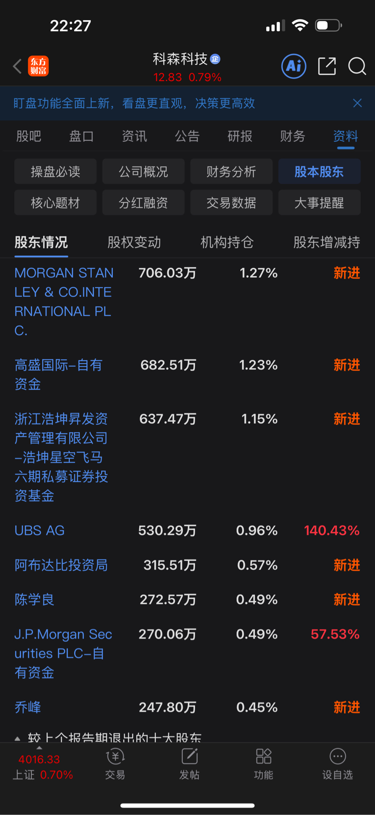 $科森科技(SH603626)$ 新近股东有摩根史丹利、高盛国际、阿布达比投资局、UBS AG(瑞士银行有限公司)是瑞银集团(UBS Group AG)的核心运营实体,作为全球领先的投资机构 ......