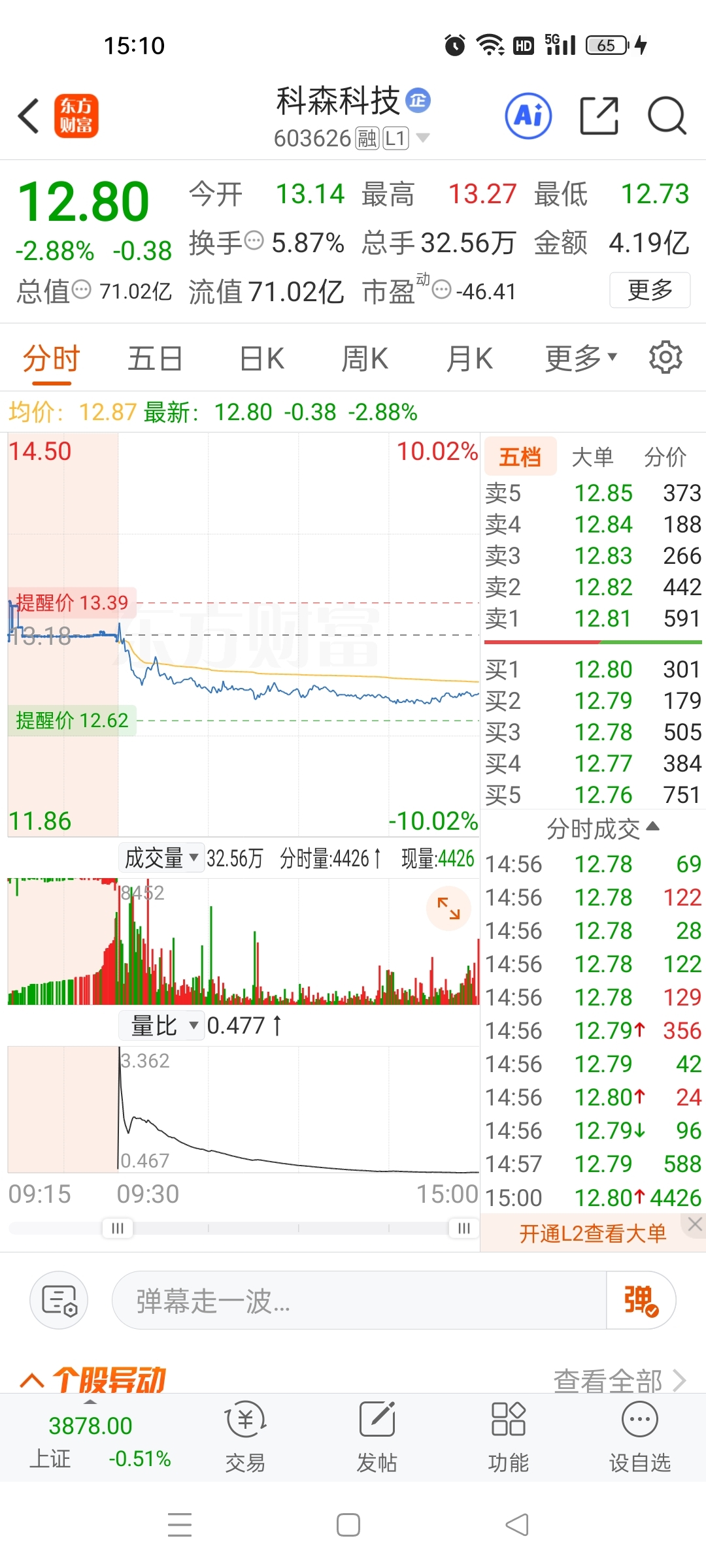 $科森科技(SH603626)$ 10.月15号的抛压,你们那么慌干啥,开盘价12.62,均价13.39抛压,13.39均价没有突破上面就是抛压,下面就是吸筹点,你往下买就是了,