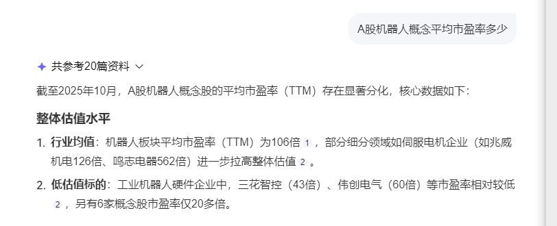 deepseek搜索的资料,目前A股机器人板块平均市盈率(TTM)为106倍1,部分细分领域如伺服电机企业(如兆威机电126倍、鸣志电器562倍)进一步拉高整体估值。