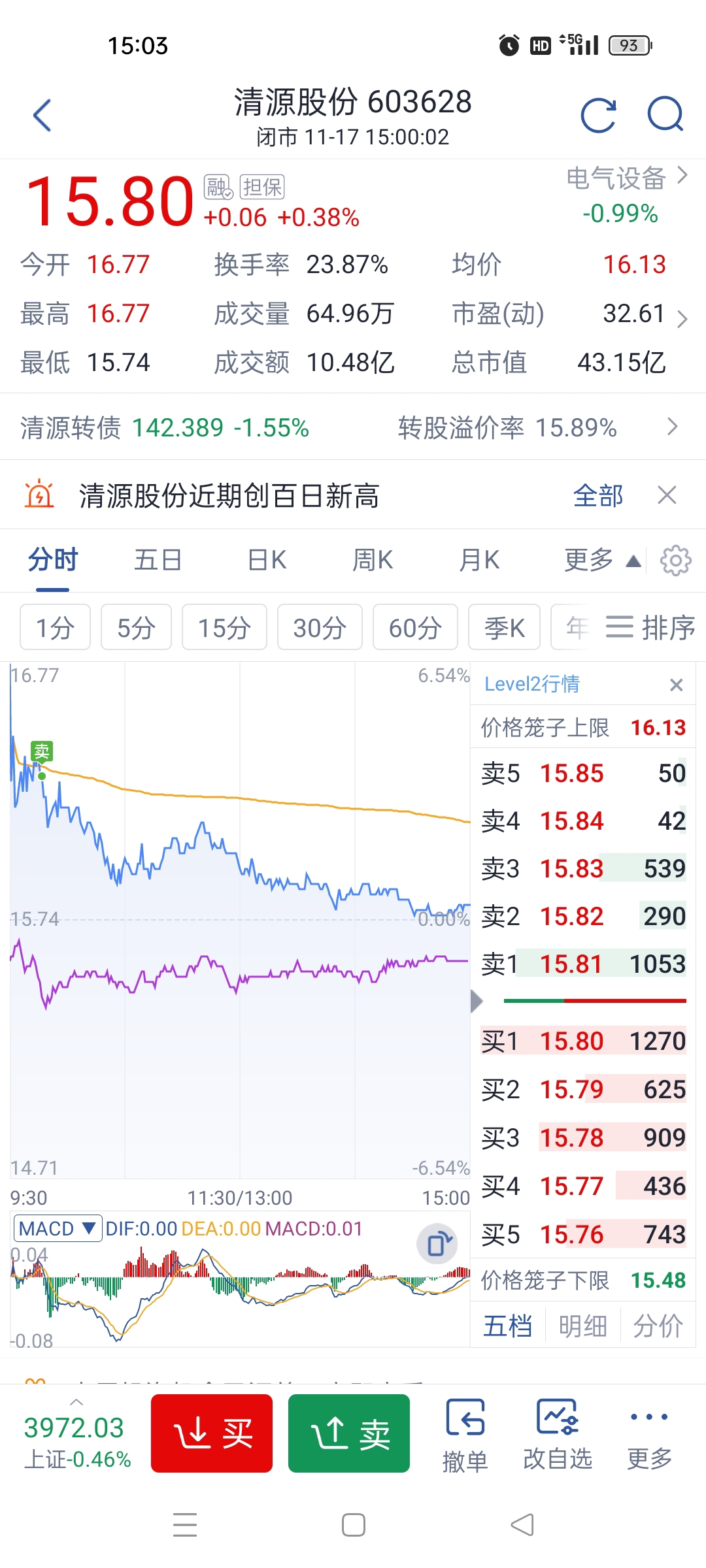$清源股份(SH603628)$ 今天早上清仓了周五剩下的清源,今天的巨量,下午仓底都没有信心补回,先休息一下,空仓一身轻啊,等待有合适的机会再进场吧