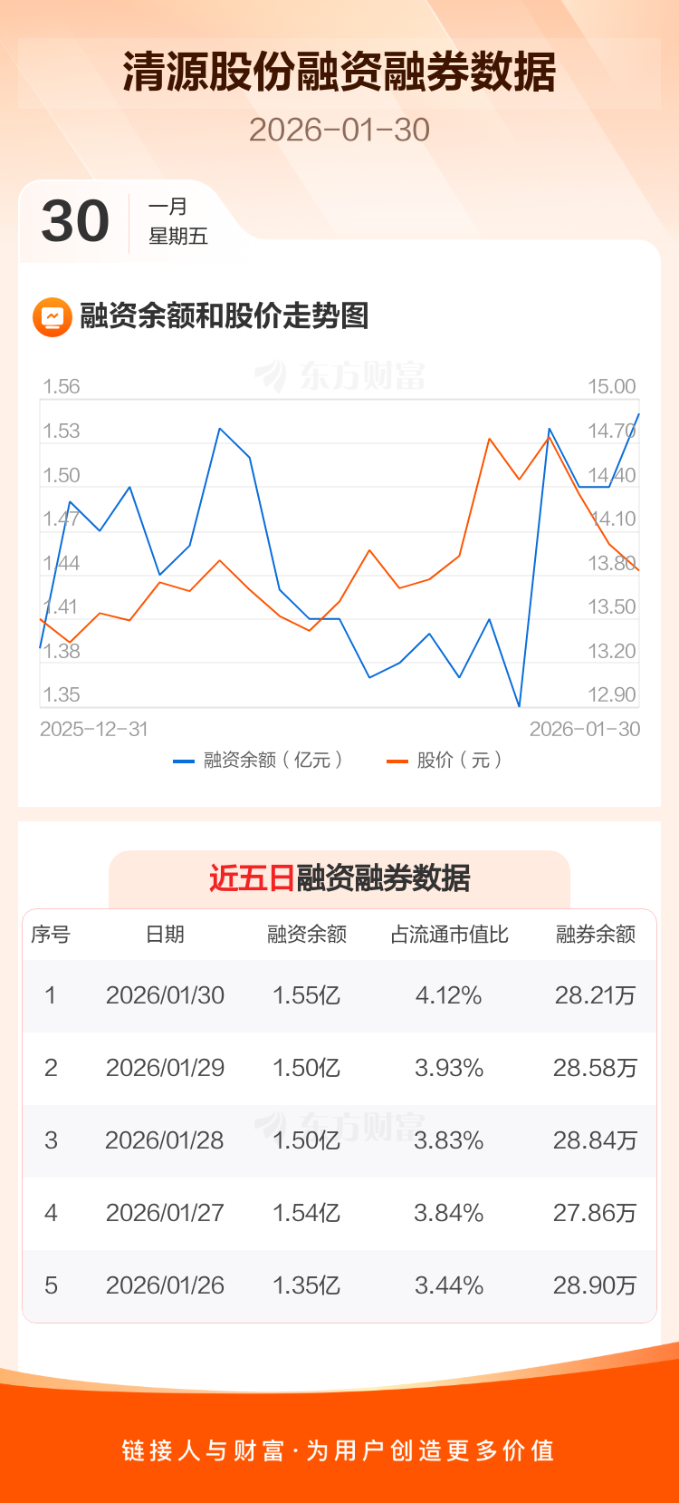 交易所最新数据显示,清源股份于2026年1月30日获融资买入2239.94万元,融资偿还1738.26万元,当日融资净买入501.68万元。目前,该股融资余额1.55亿,占流通市值比例为4.12%。