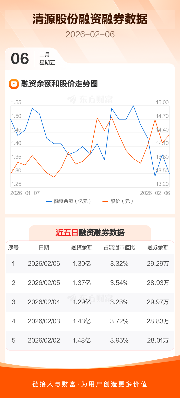 交易所最新数据显示,清源股份于2026年2月6日获融资买入1195.34万元,融资偿还1893.48万元,当日融资净偿还698.14万元。目前,该股融资余额1.30亿,占流通市值比例为3.32%。