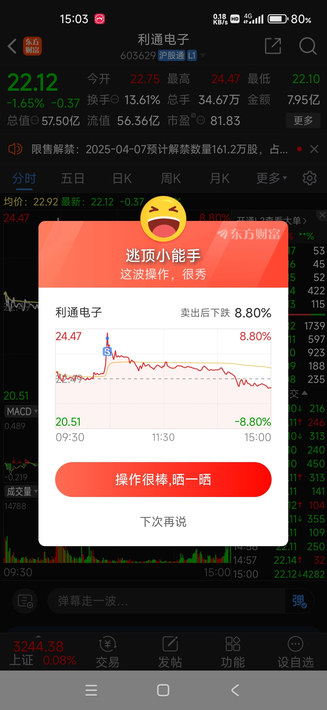 $利通电子(SH603629)$ 好消息是冲高卖了,坏消息是只卖了一半