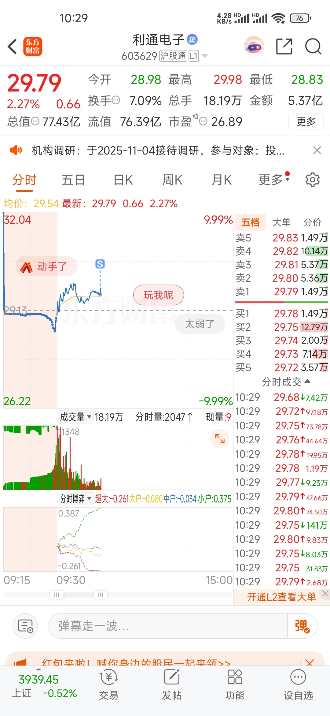 $利通电子(SH603629)$ 玩我能主力盯着我不成 刚卖没两秒就拉上去了