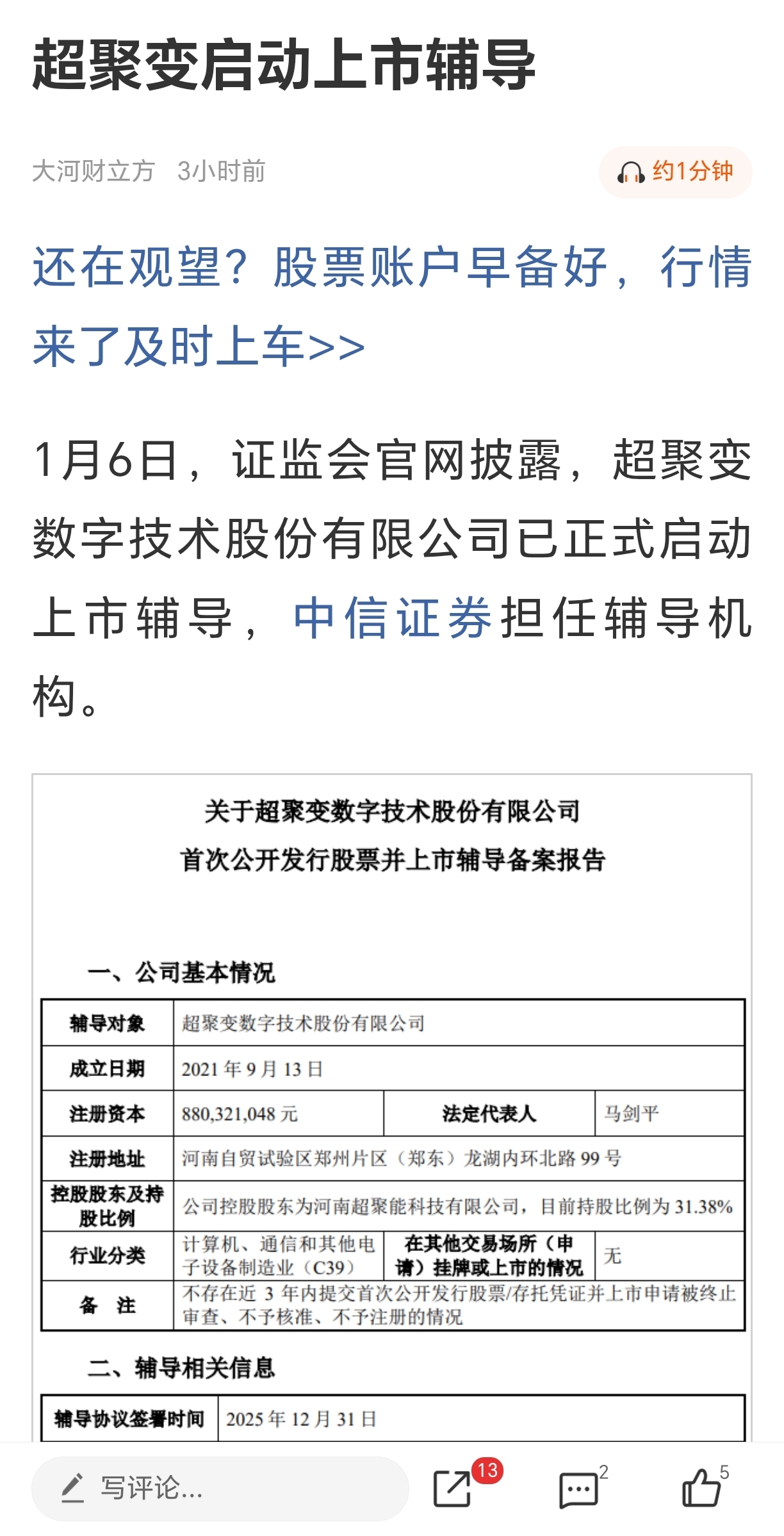 超聚变今天也辅导上市,下午应该会带一波吧