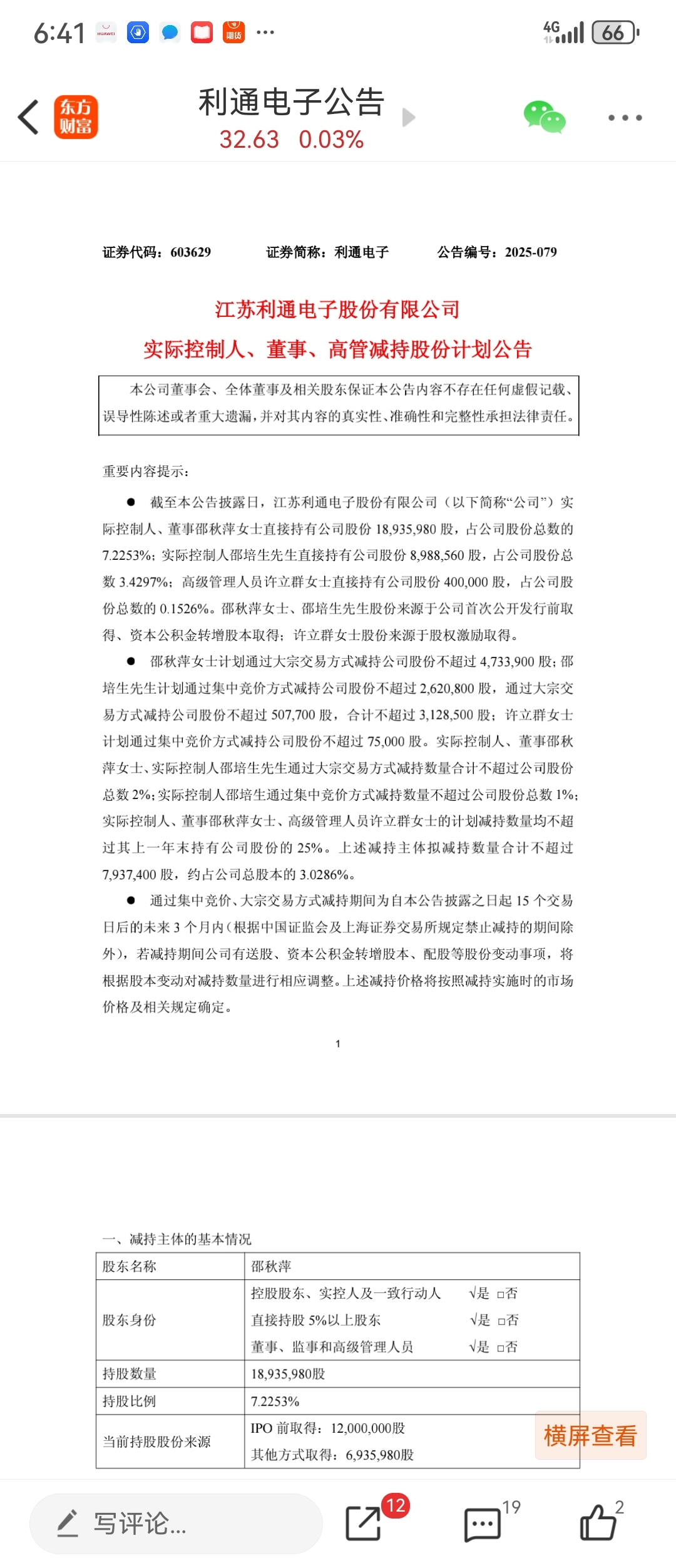 $利通电子(SH603629)$ 3%的减持,专治各种追高打板