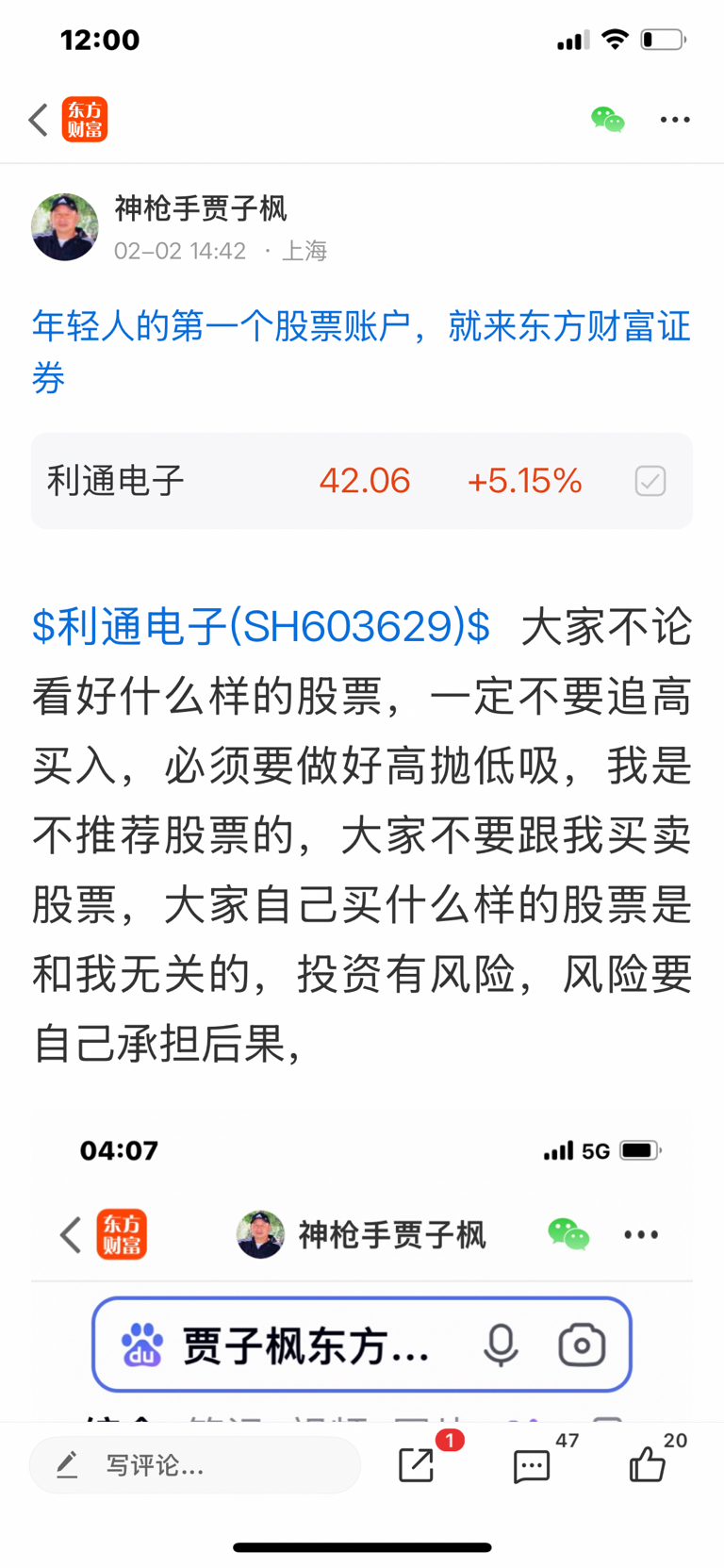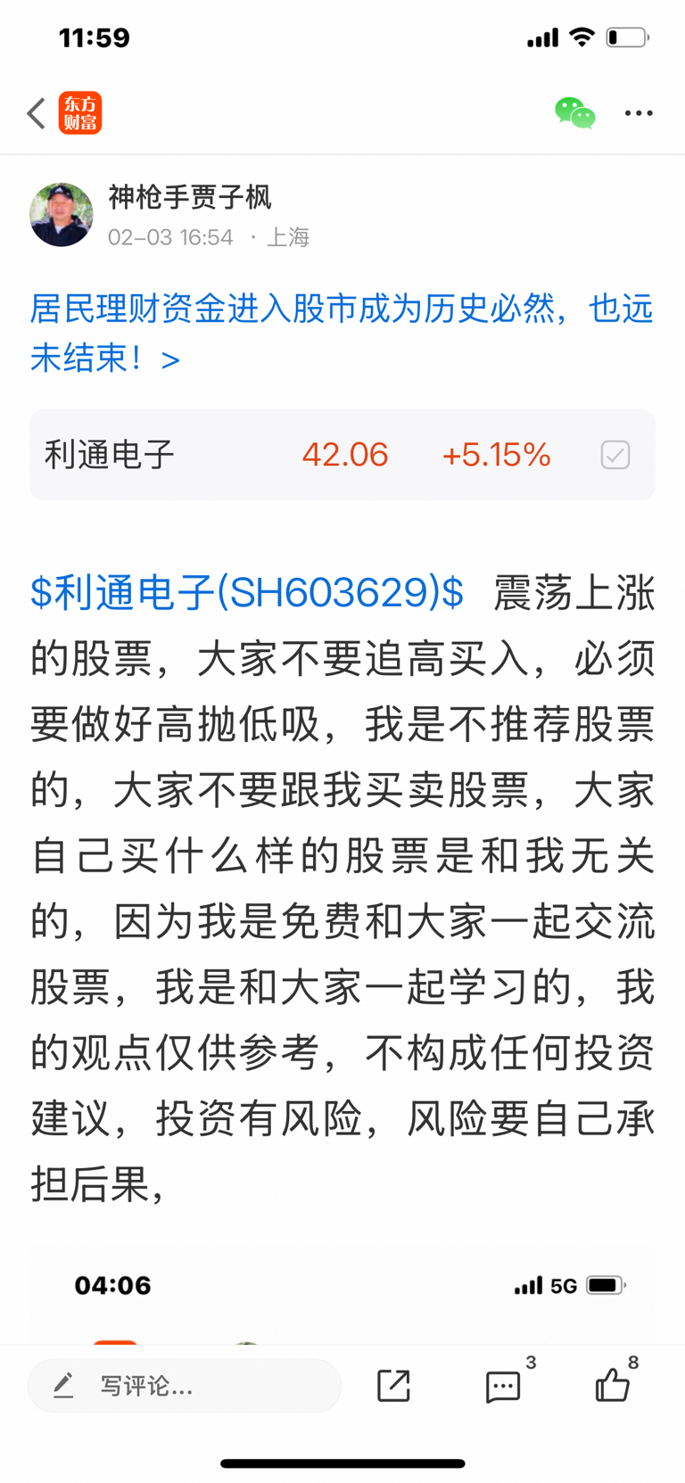 $利通电子(SH603629)$ 这个股我是二月二号发表看涨的股票,大家不要追高买入,必须要做好高抛低吸,我是不推荐股票的,大家不要跟我买卖股票,大家自已买什么样的股票是和我无关的,我是和大家交流股票,我是和大家一起学习的,投资有风险,风险要自己承担后果,