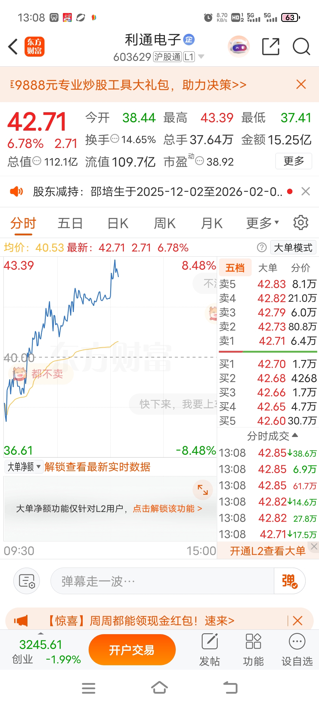 $利通电子(SH603629)$ 看你能不能站稳了,42.6