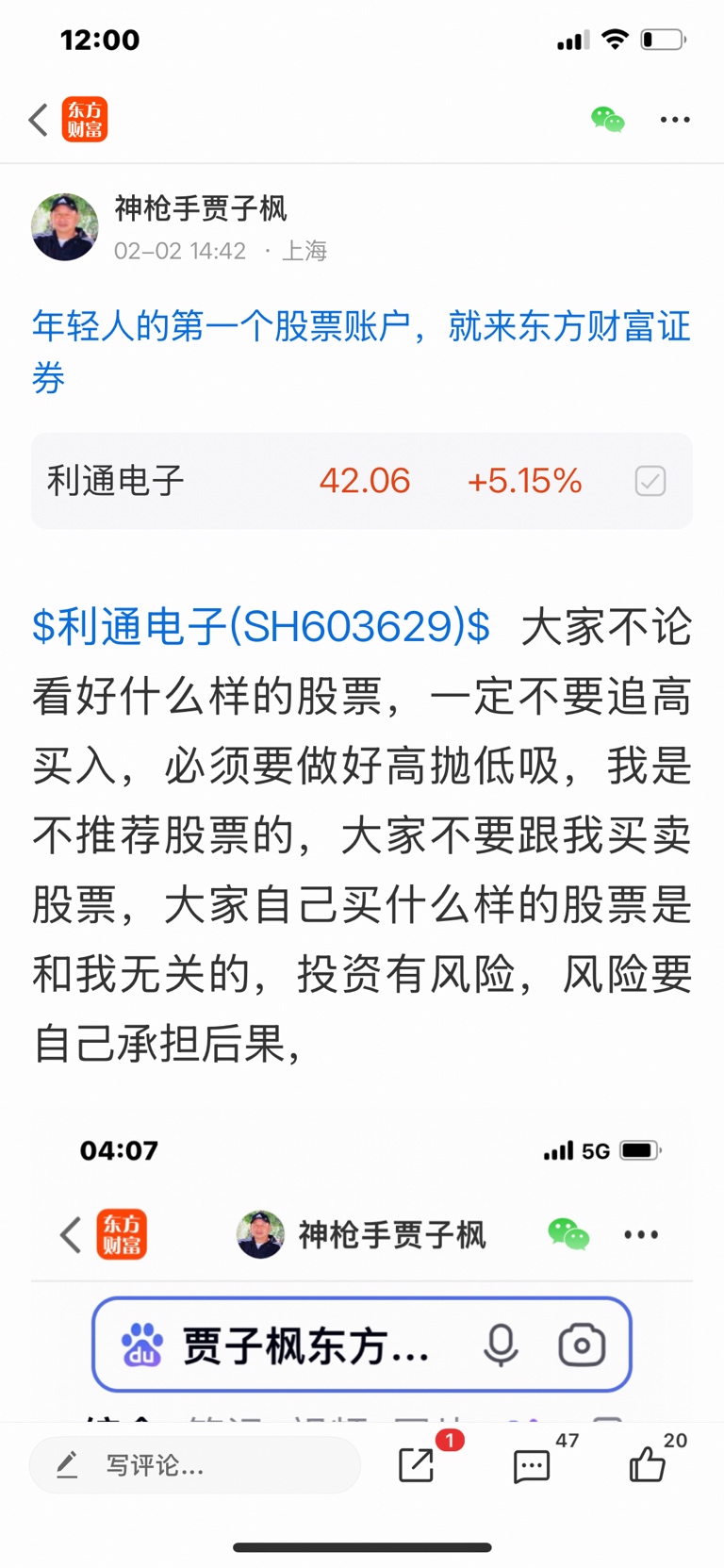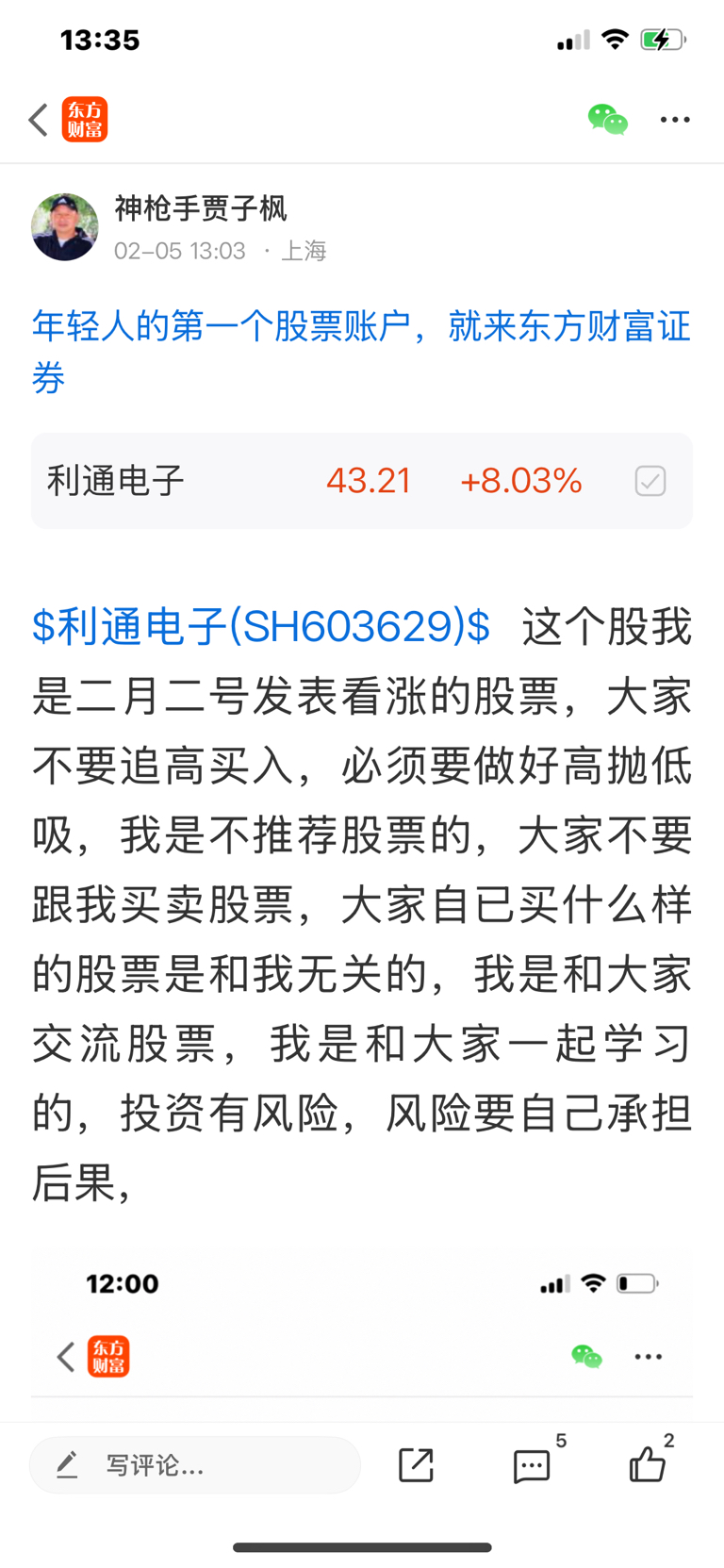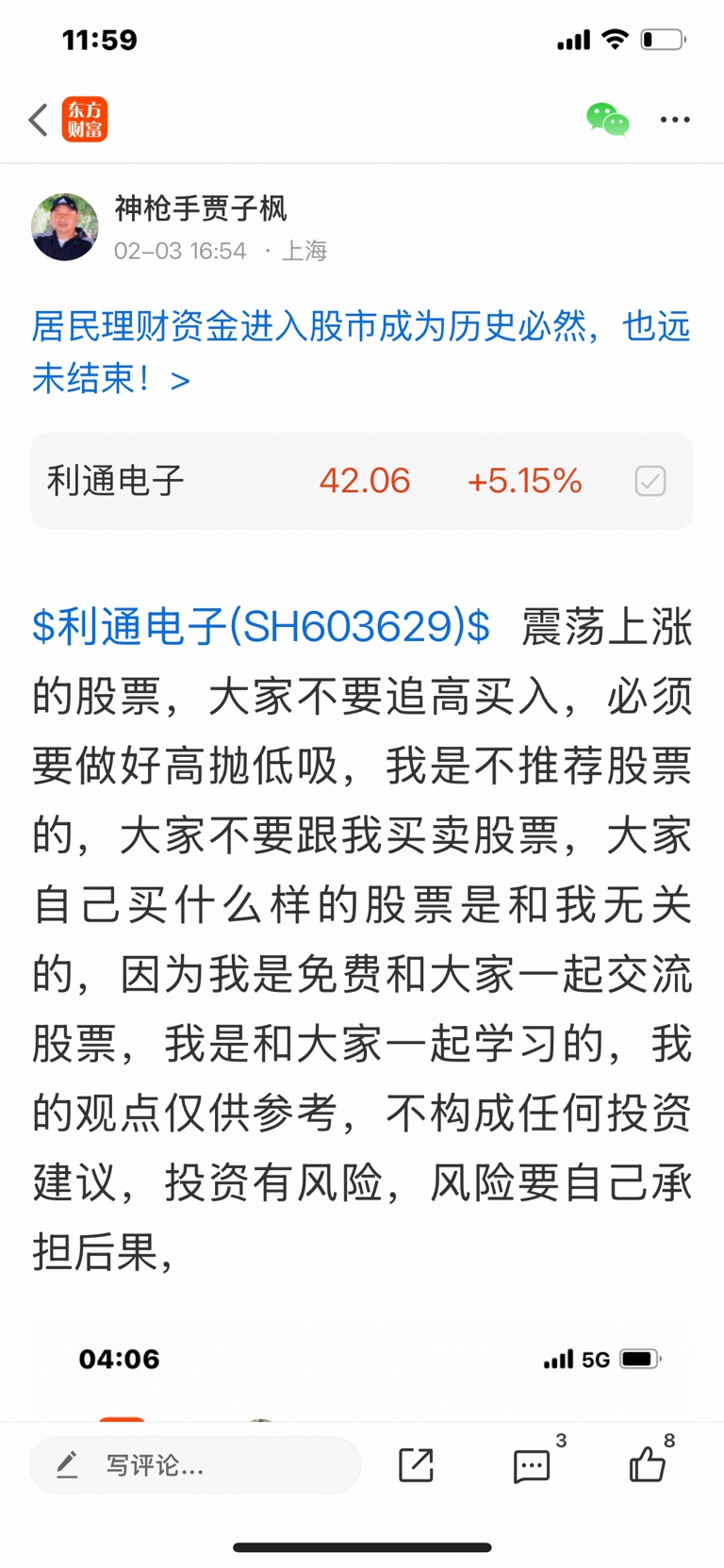 $利通电子(SH603629)$ 这个股我是二月二号发表看涨的股票,大家不要追高买入,必须要做好高抛低吸,我是不推荐股票的,大家不要跟我买卖股票,大家自己买什么样的股票是和我无关的,因为我是免费和大家一起交流股票,我是和大家一起学习的,我的观点仅供参考,投资有风险,风险要自己承担后果,