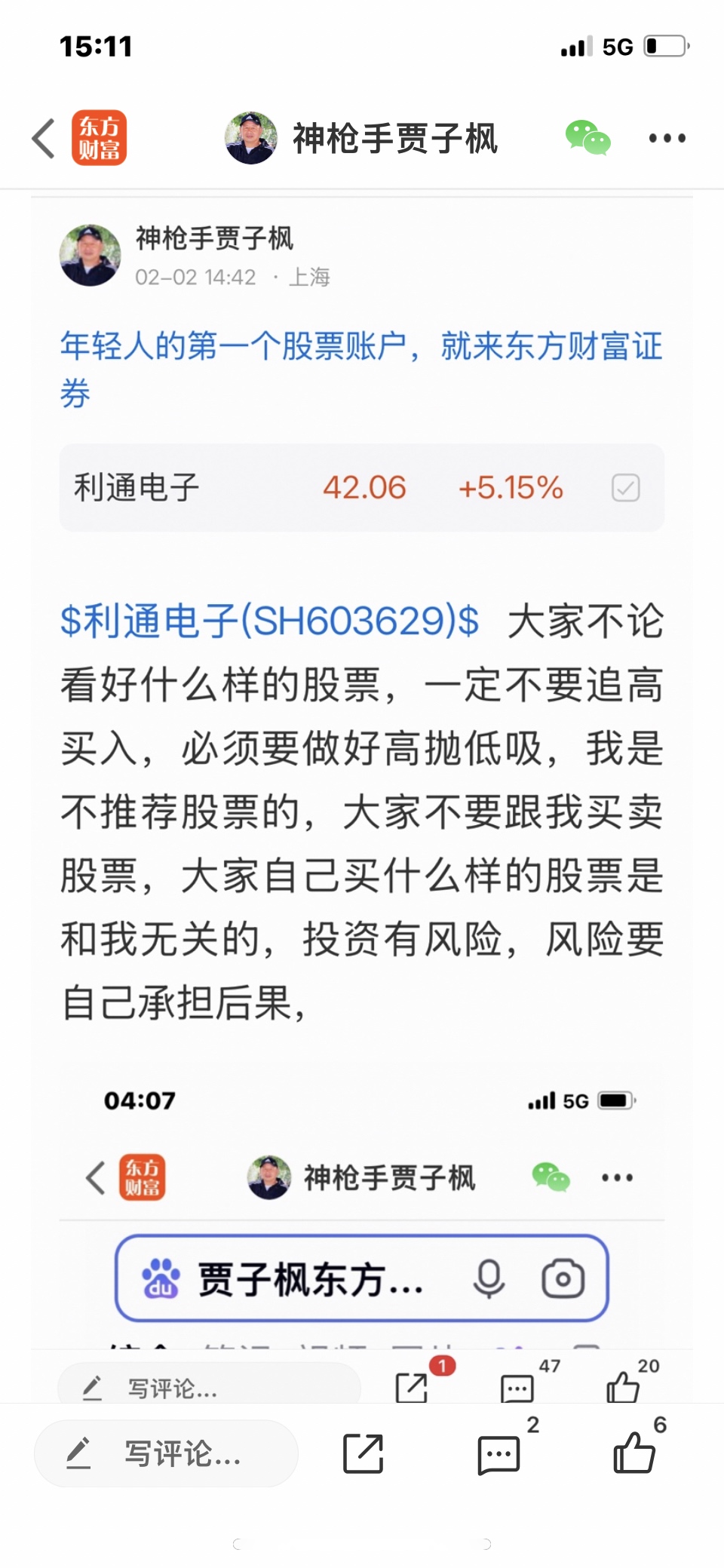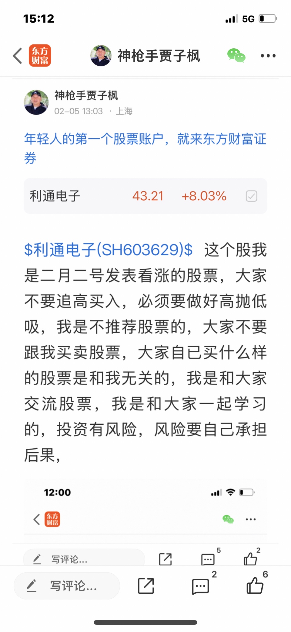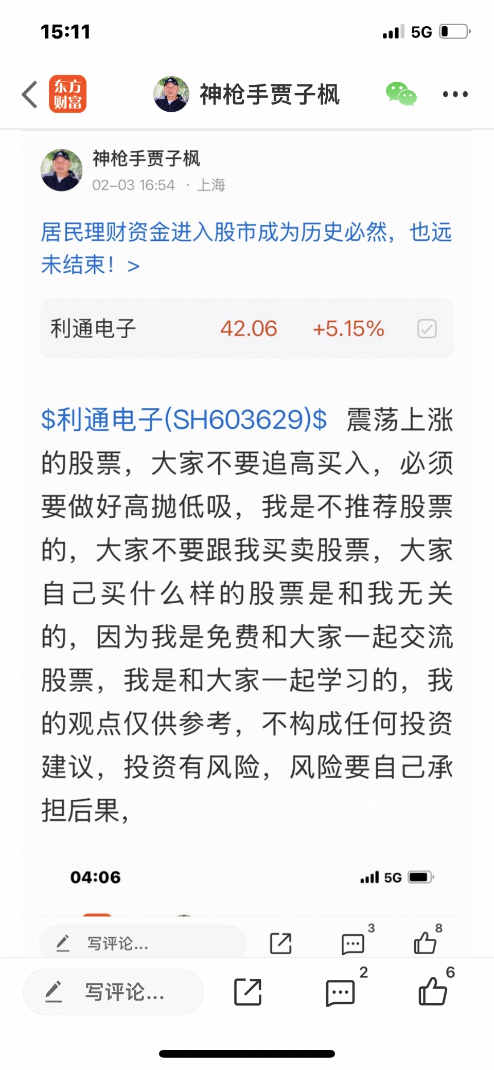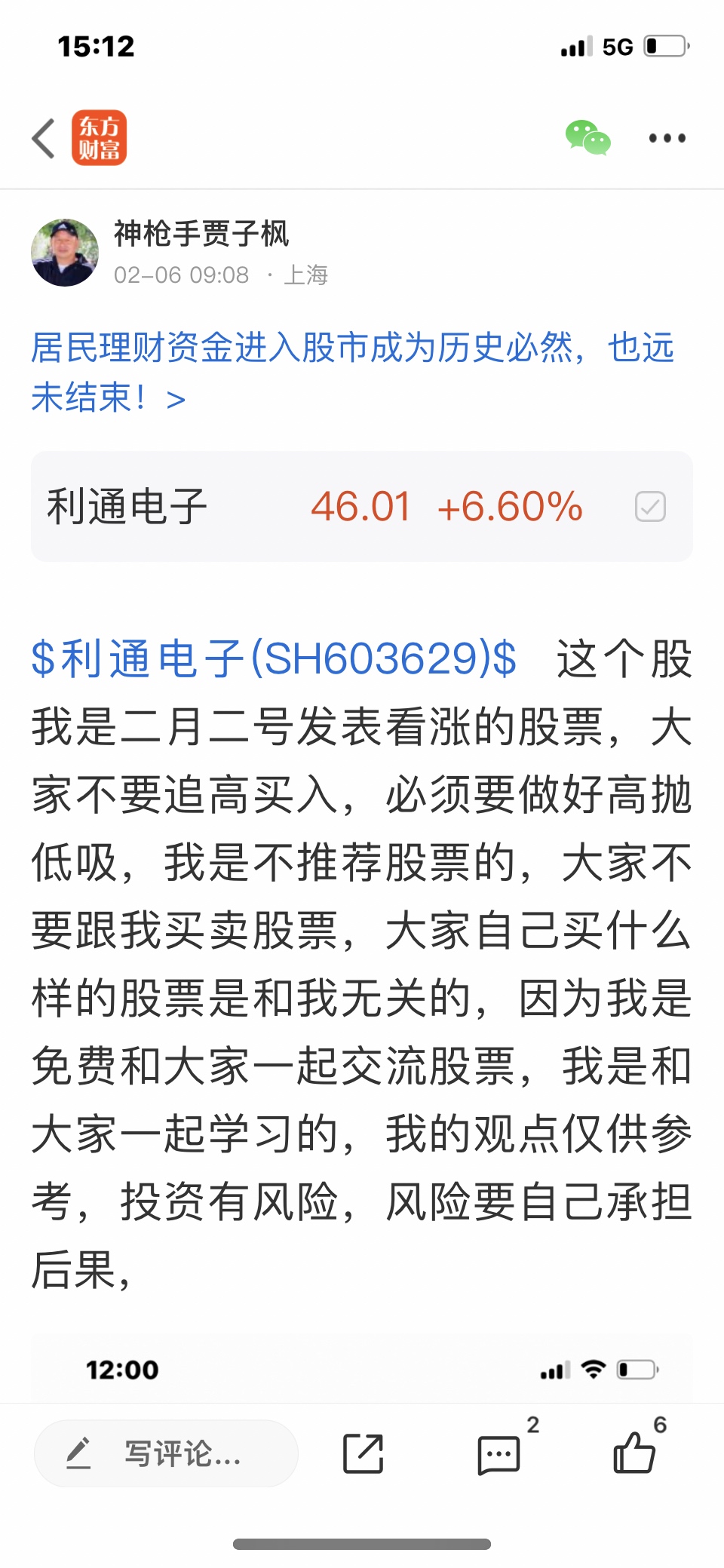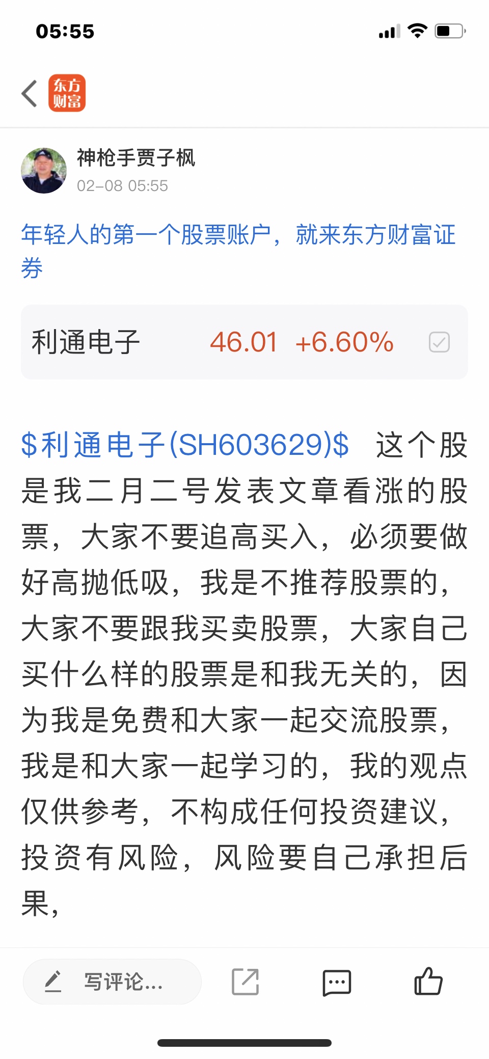 $利通电子(SH603629)$ 这个股我是二月二号发表文章看涨的股票,大家不要追高买入,必须要做好高抛低吸,我是不推荐股票的,大家不要跟我买卖股票,大家自己买什么样的股票是和我无关的,我是免费和大家一起交流股票,我是和大家一起学习的,我的观点仅供参考,投资有风险,风险要自己承担后果,