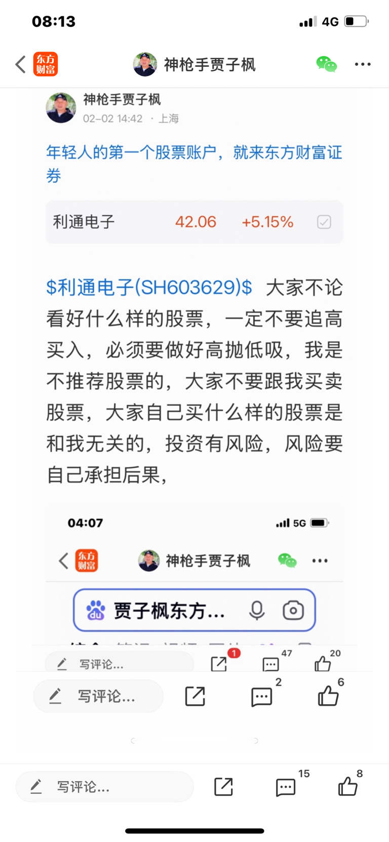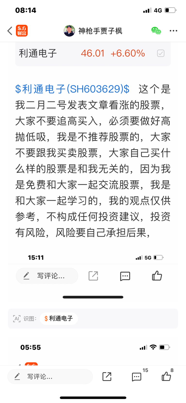 $利通电子(SH603629)$ 这个股我是二月二号发表文章看涨的股票,大家不要追高买入,必须要做好高抛低吸,我是不推荐股票的,大家不要跟我买卖股票,大家自己买什么样的股票是和我无关的,因为我是免费和大家一起交流股票,我是和大家一起学习的,我的观点仅供参考,投资有风险,风险要自己承担后果,