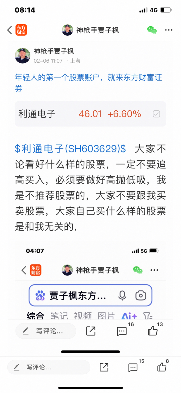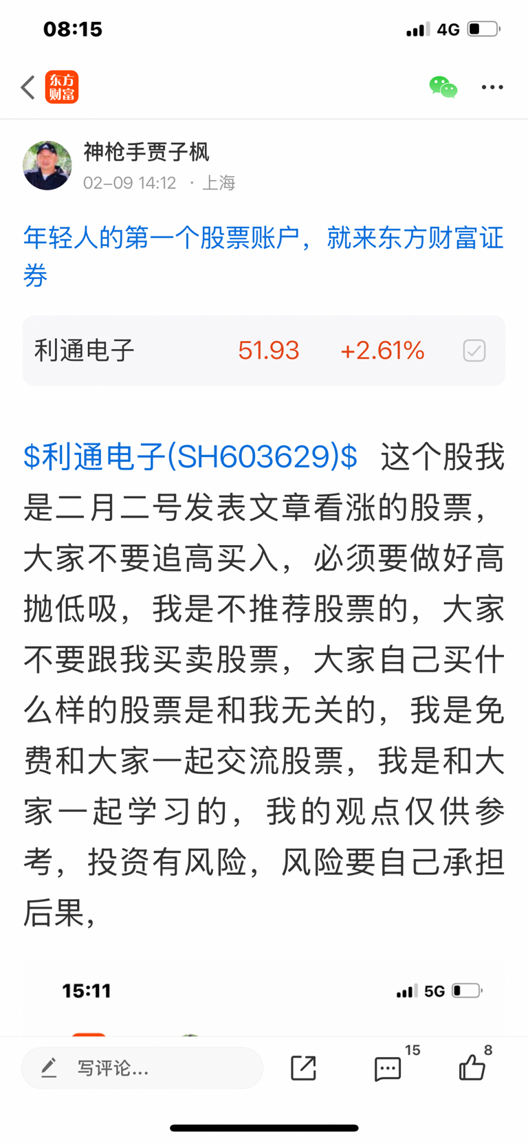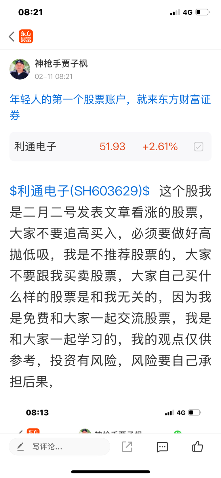 $利通电子(SH603629)$ 这个股我是二月二号发表文章看涨的股票,大家不要追高买入,必须要做好高抛低吸,我是不推荐股票的,大家不要跟我买卖股票,大家自己买什么样的股票是和我无关的,因为我是免费和大家一起交流股票,我是和大家一起学习的,我的观点仅供参考,投资有风险,风险要自己承担后果,