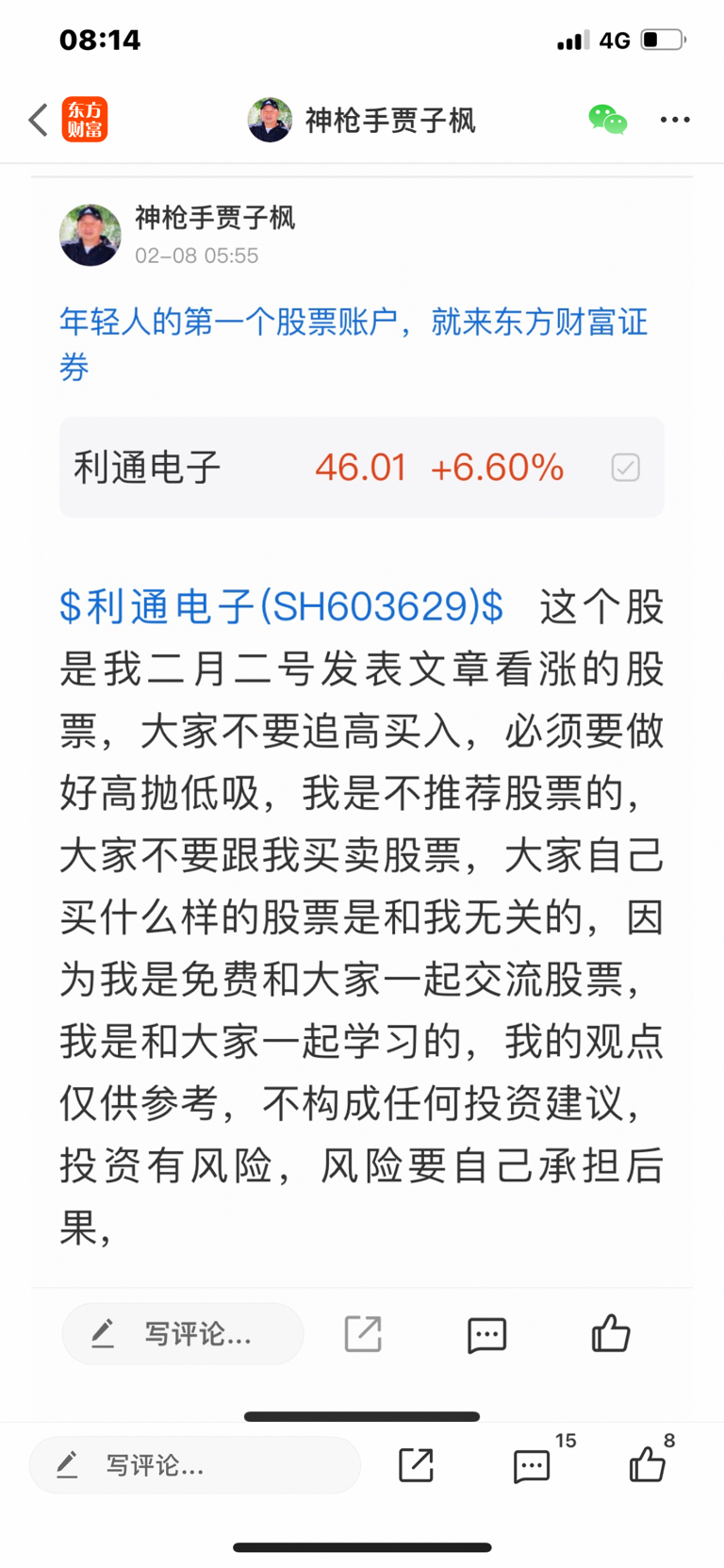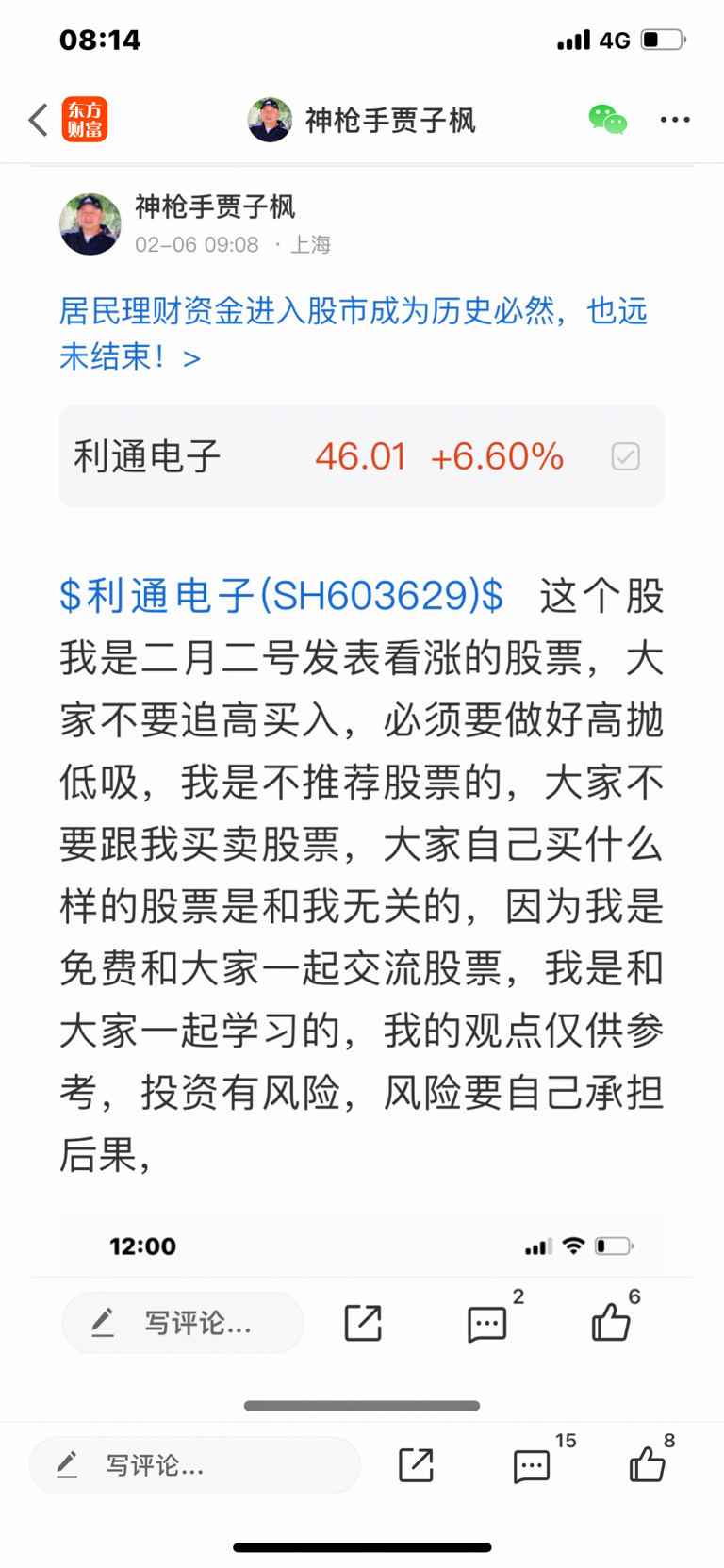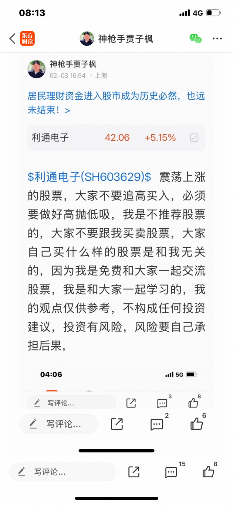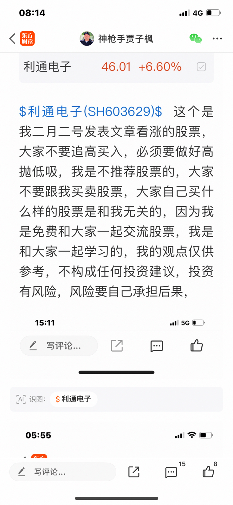 $利通电子(SH603629)$ 这个股我是二月二号发表文章看涨的股票,大家不要追高买入,必须要做好高抛低吸,我是不推荐股票的,大家不要跟我买卖股票,大家自己买什么样的股票是和我无关的,因为我是免费和大家一起交流股票,我是和大家一起学习的,我的观点仅供参考,投资有风险,风险要自己承担后果,