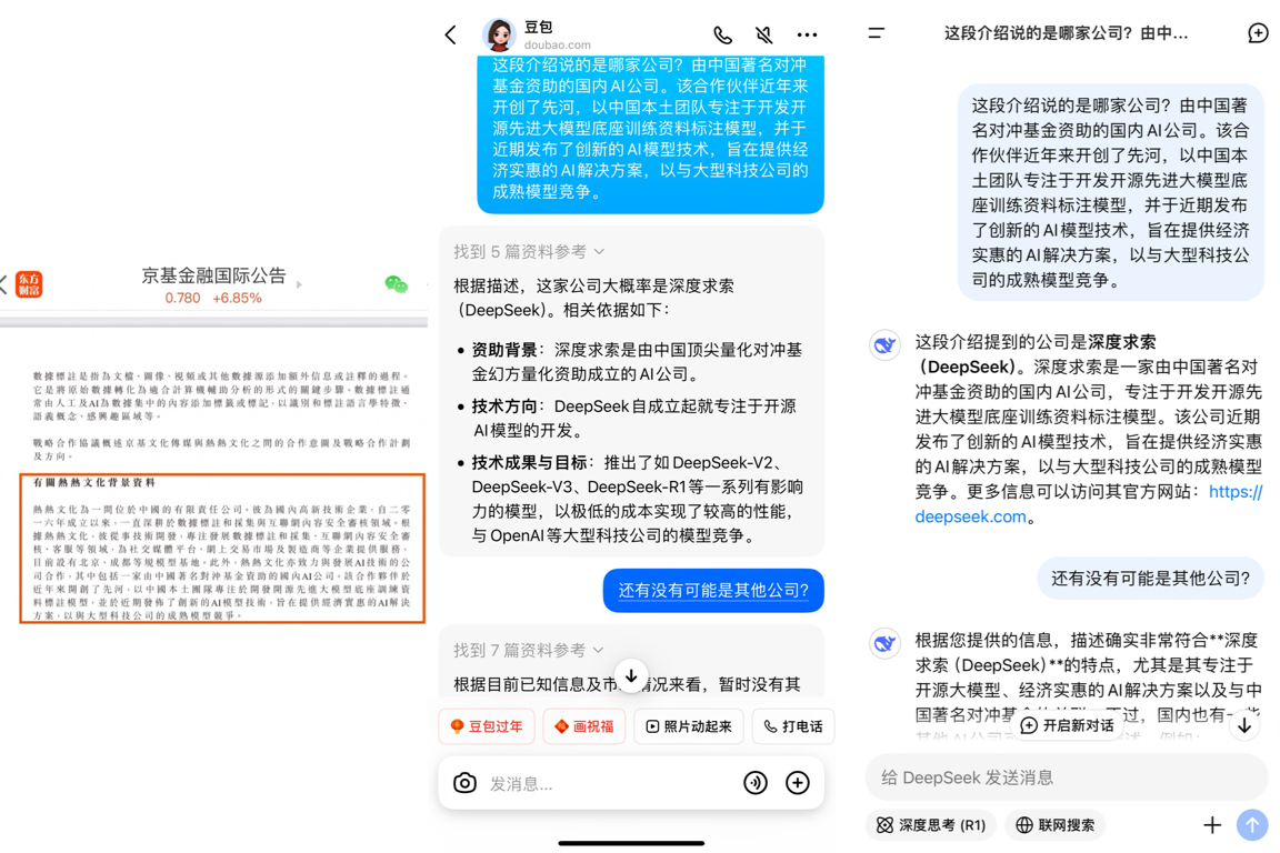 $南威软件(SH603636)$$美格智能(SZ002881)$$泛微网络(SH603039)$京基在1月27日发公告,称与热热文化合作成立公司,专注探索AI业务,重点:在公告里热热的介绍中,描述了热热目前在与一家(此处省略200字)的公司合作,经过复制描述后询问豆包和deepseek本身,均回答就是deepseek。这可厉害了,比那些博主制作的名单里面,只接入了deepseek就被说成合作的股强太多,因为deepseek是开源的,谁都可以接入并被夸大成与深度求索合作,而热热是实打实的给深度求索提供技术支持,公司和公司的合作,肯定厉害啦。
