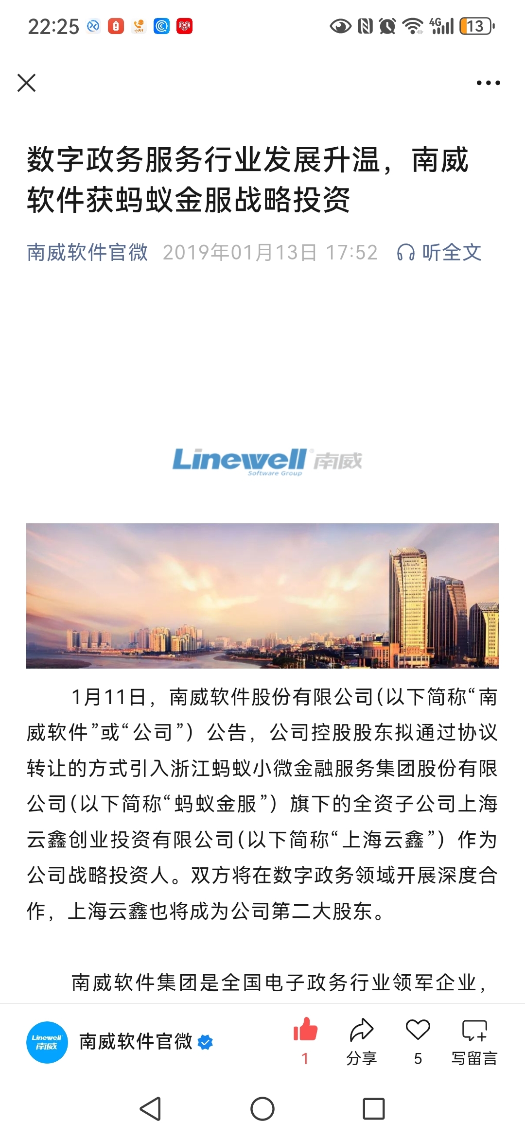 $南威软件(SH603636)$ 阿里做为南威软件的股东,真是缺几个涨停啊!!!