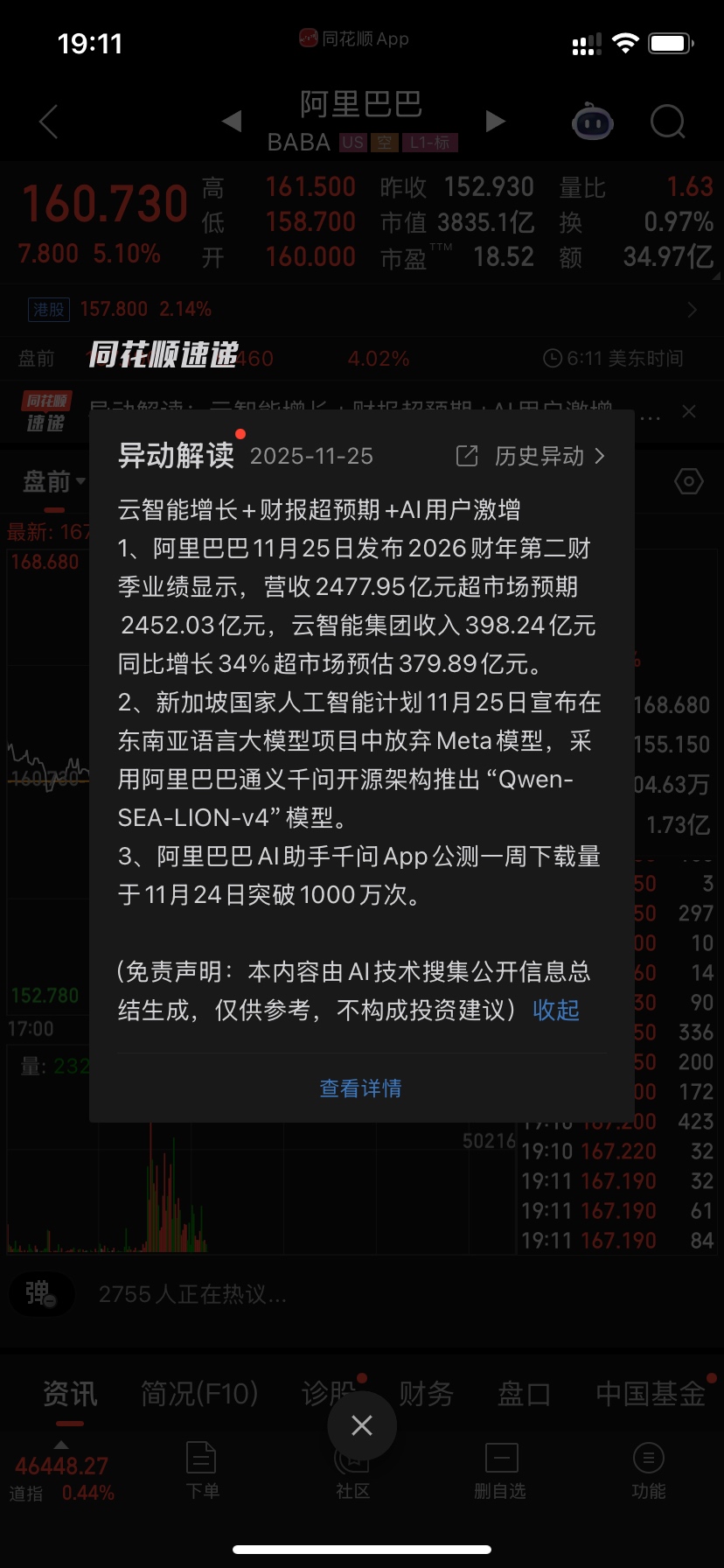 最新:美股阿里巴巴盘前涨超4%,公司第二财季营收超预期。人工智能+云计算和消费两